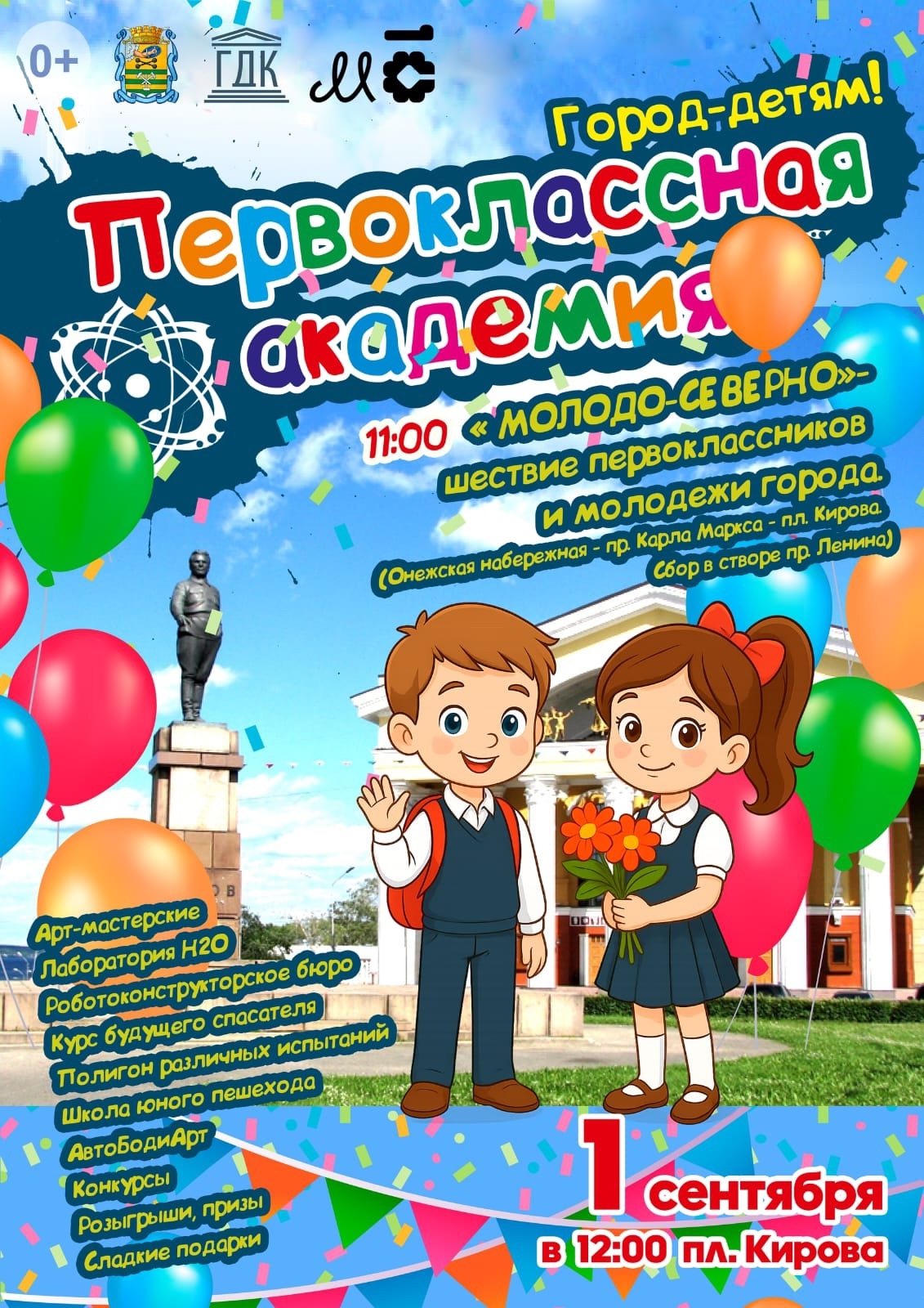 В 11:00 начнется праздничное шествие первоклассников. Вместе с ребятами пройдет и активная молодежь города. Шествие начнется от створа проспекта Ленина, пройдет по Онежской набережной и поднимется на площадь Кирова.
