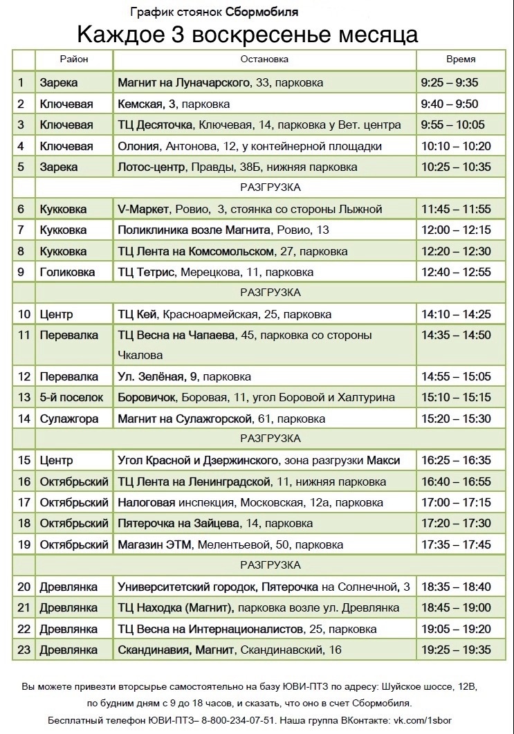 В расписании – 23 остановки в разных районах карельской столицы. Также привезти вторсырье можно самостоятельно на базу ЮВИ ПТЗ по адресу: Шуйское шоссе, 12В, по будним дням с 9 до 17 часов, сообщив, что оно в счет Сбормобиля.