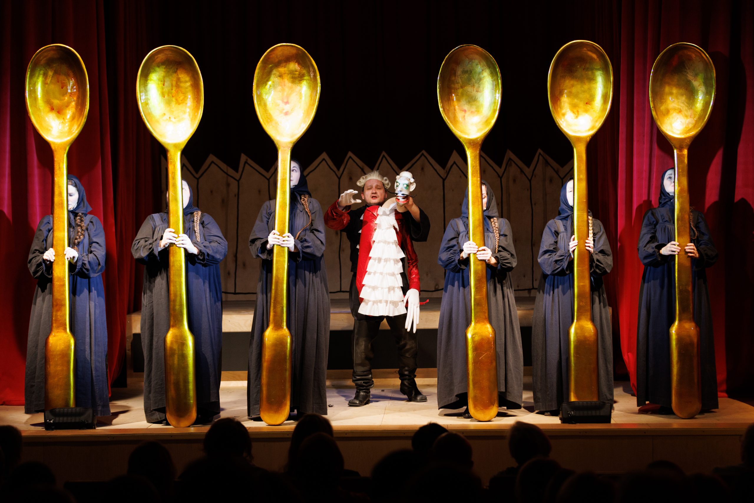 В центре сюжета — женские персонажи, противопоставляющие свою силу духа и ответственность мужской слабости и инфантильности. Как и в любом другом водевиле, постановка наполнена музыкой, песнями и куплетами, комичными ситуациями и даже элементами театрального «хулиганства». Необычные куклы, становящиеся выразительными персонажами, добавят зрелищу особый шарм. Сценография постановки, пародирующая стиль оперного театра, усиливает комедийный эффект.