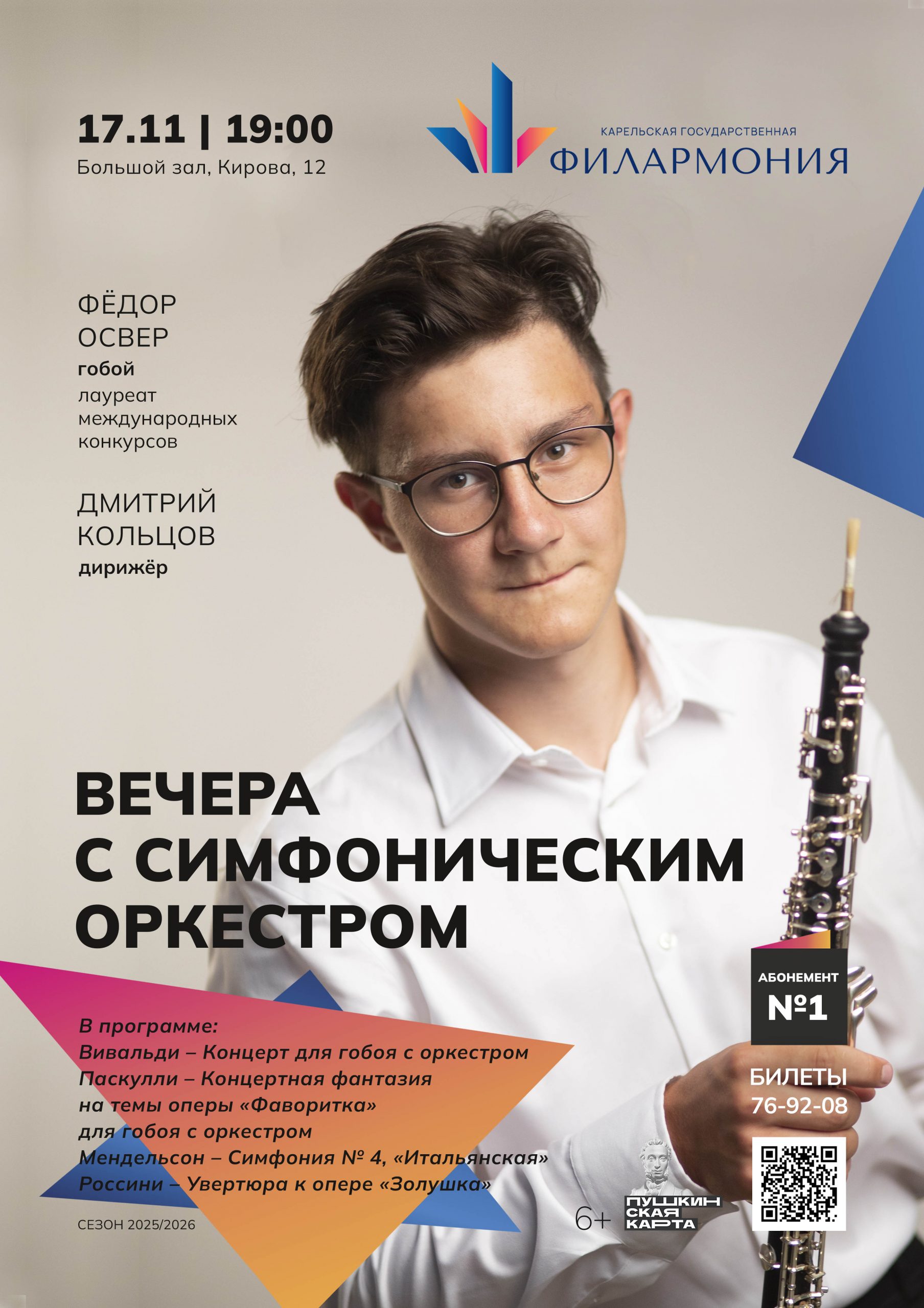 В исполнении Фёдора Освера и Симфонического оркестра филармонии под управлением Дмитрия Кольцова прозвучит виртуозные сочинения Антонио Вивальди и Антонио Паскулли — музыка, созданная в «золотой век гобоя». Так называют XVIII век, потому что именно в этот период инструмент достиг своего расцвета и стал широко использоваться для сольных, ансамблевых и оркестровых партий.