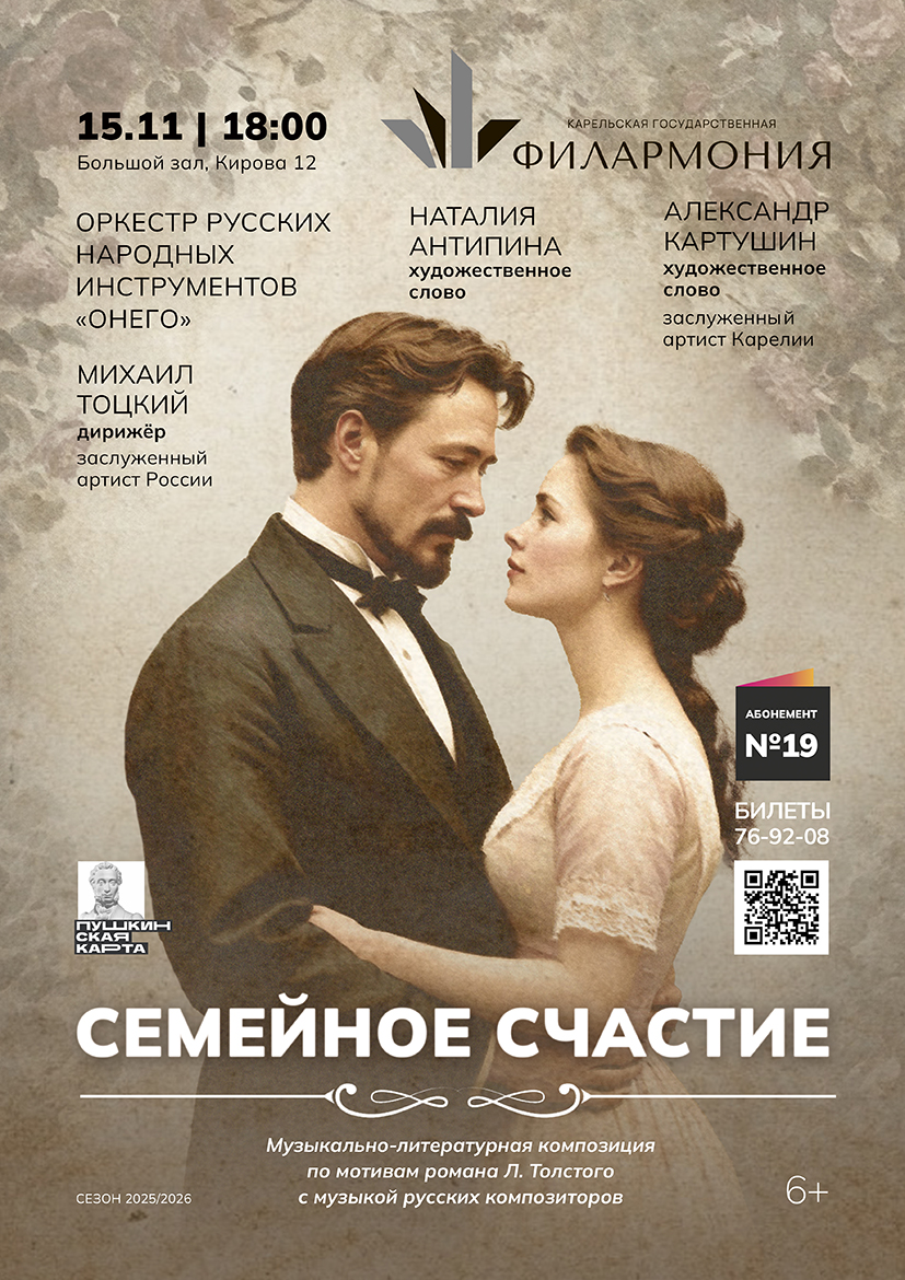 Исполнители: Оркестр русских народных инструментов «Онего», дирижёр – заслуженный артист России Михаил Тоцкий. Художественное слово: заслуженный артист Карелии Александр Картушин и актриса Негосударственного авторского театра Ad Liberum Наталия Антипина. В программе: роман Льва Толстого, музыка русских композиторов.