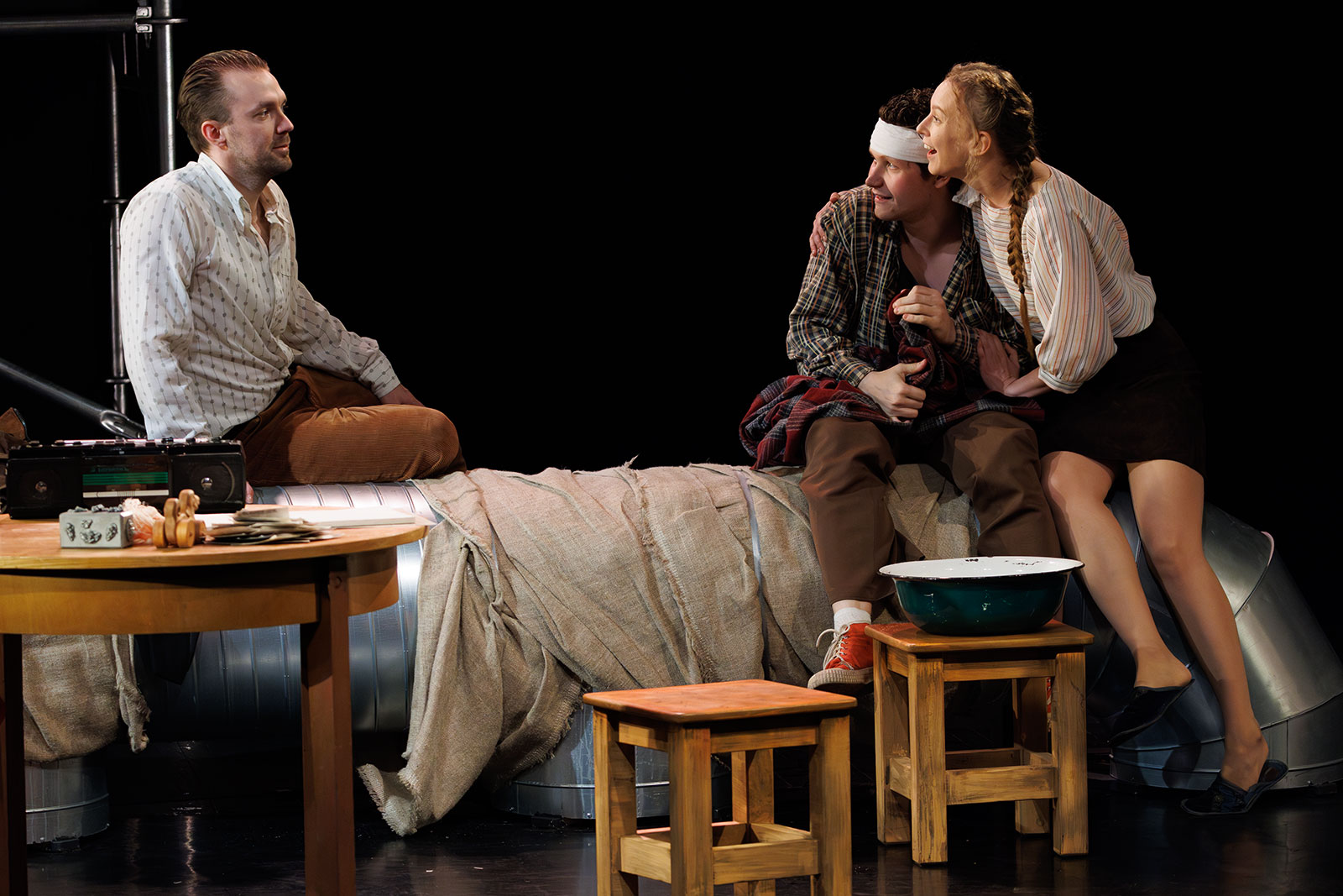 В центр истории режиссер премьерного спектакля Национального театра Карелии Сергей Гук ставит проблему распада семьи и поиск выхода из кризисной ситуации. Сарафанов-старший, потеряв внутреннюю опору после ухода жены, теряет возможность дать своим детям столь необходимую им поддержку и заботу. Привычный и уютный мир рассыпается, и дом перестает быть домом, а становится каким-то непонятным местом обитания. Внутренняя неустроенность героев нашла свое отражение в художественном оформлении спектакля, которое относит нас одновременно и ко времени пьесы Вампилова, и к условным 1980-ым годам советского прошлого. Режиссеру важно сохранить дистанцию как от реального прошлого, так и от дня сегодняшнего.