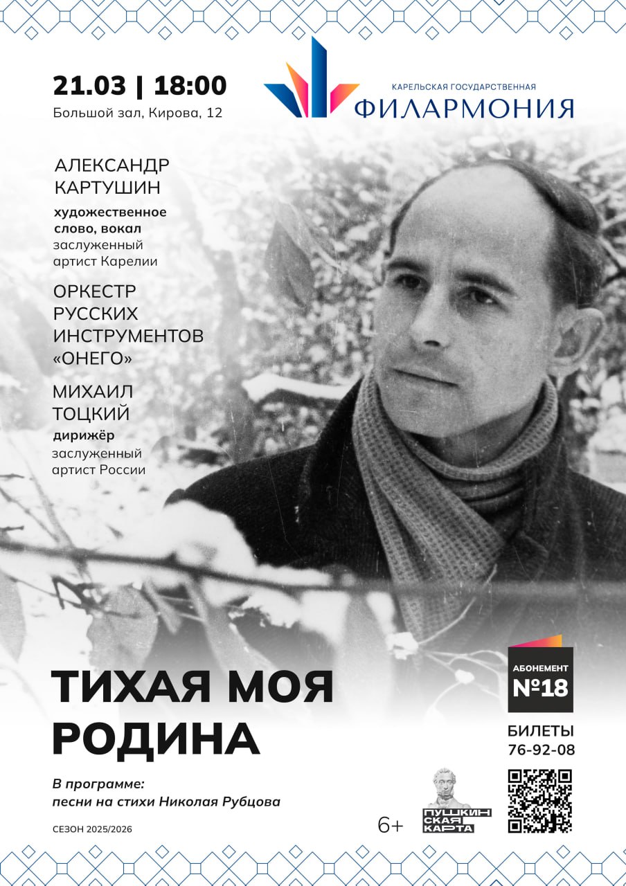 Это заключительный концерт авторского абонемента заслуженного артиста Карелии Александра Картушина «От первого лица». Он будет посвящён творчеству Николая Рубцова, одного из самых загадочных русских поэтов.