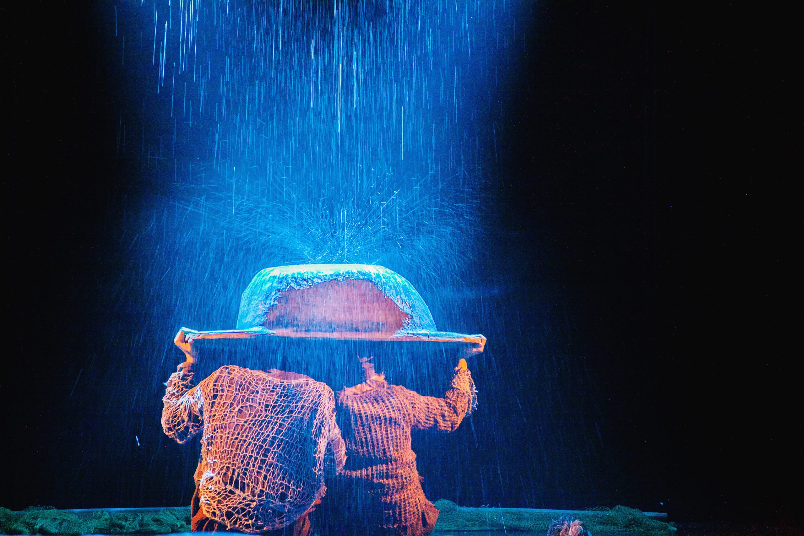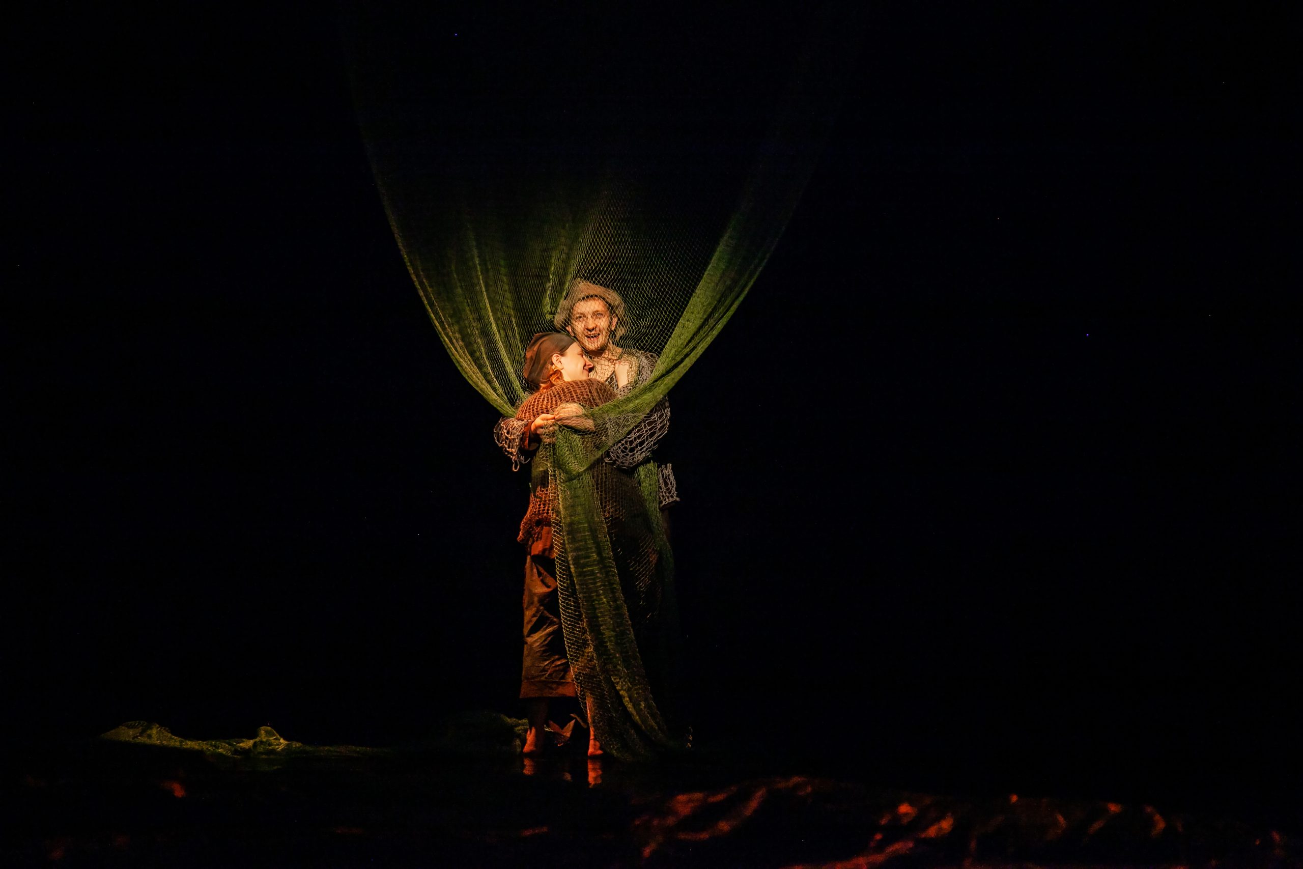 Режиссёрский жанр спектакля — «притча о семейной жизни для взрослых, очень взрослых и детей». В названии нет слова «сказка», потому что это совсем не сказка. В спектакле «О рыбаке и рыбке» Яны Туминой есть и вертикаль между Богом и человеком, философский подтекст и метафоричность… Но притчевый слой — это один из смысловых уровней спектакля. В спектакле можно найти утопию и антиутопию, монодраму, трагедию, фарс, балаган и даже элементы мистерии и миракля.
