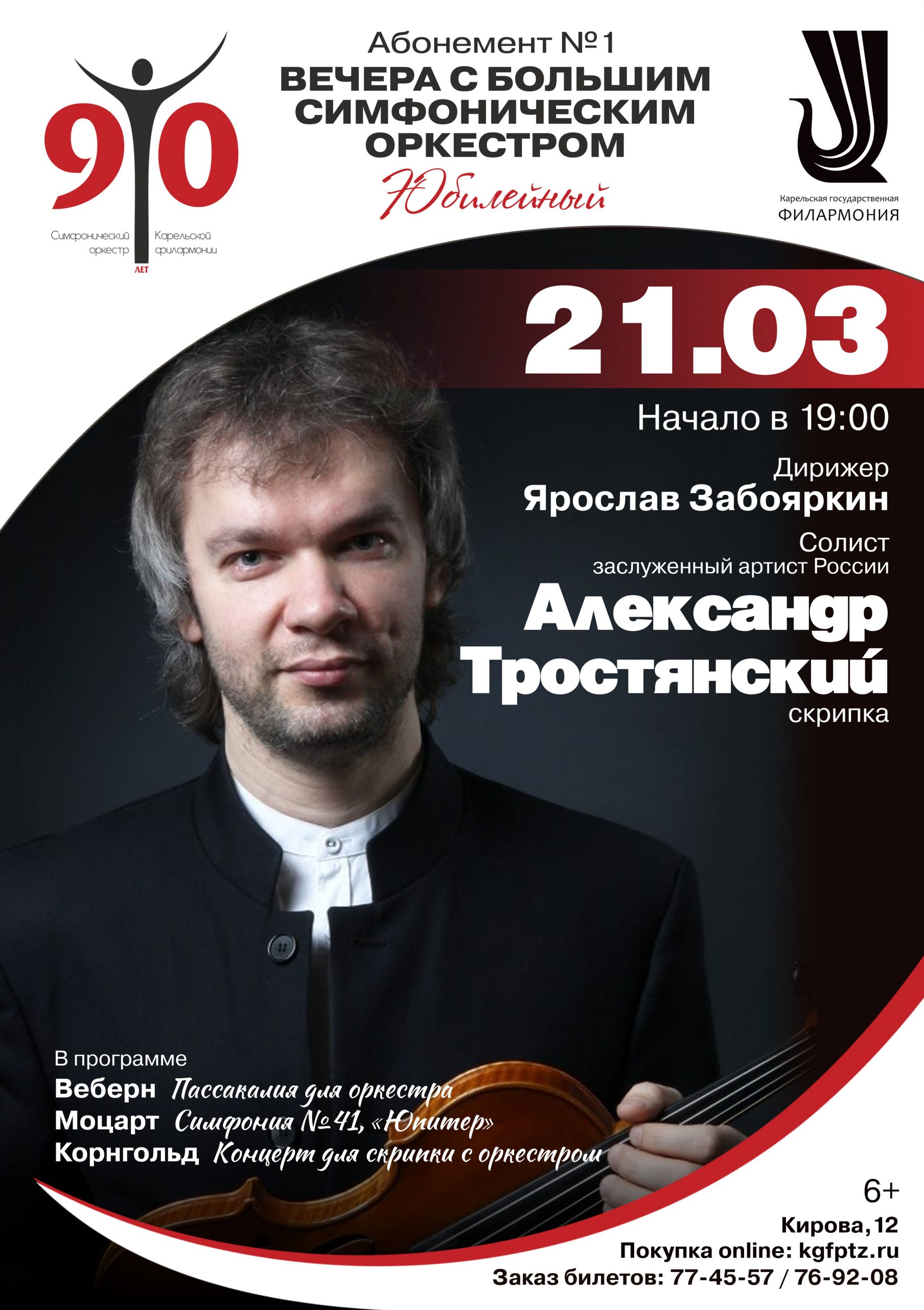 В юбилейный сезон 90-летия коллектив принимает звездных гостей. На сцене филармонии с симфоническим оркестром выступит блистательный скрипач — Александр Тростянский.