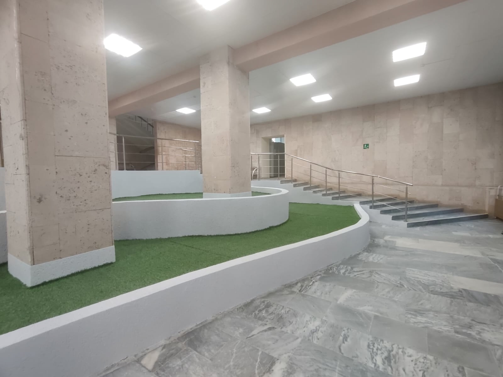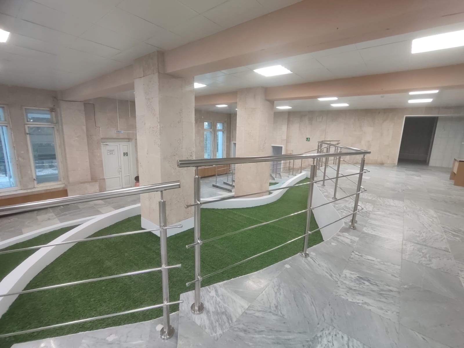 Так, почти отремонтирован холл, проведены сети водоснабжения, водоотведения, канализации в туалет, а также сети электроснабжения. Появился новый потолок. Террасы отделаны современными материалами под штукатурку «короед», на ярусах уложена искусственная трава. На месте старых телефонных будок появилось новое пространство регистратуры, гардероб стал больше, появился туалет для инвалидов.