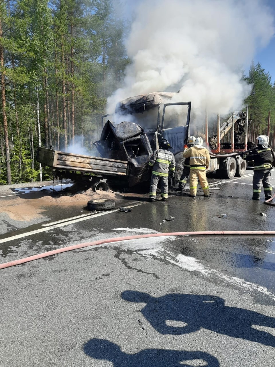 Как рассказали в ГИБДД Карелии, водитель автомобиля ГАЗель выехал на полосу встречного движения, где столкнулся с лесовозом. ГАЗель загорелась, водитель погиб. Водителя лесовоза госпитализировали.