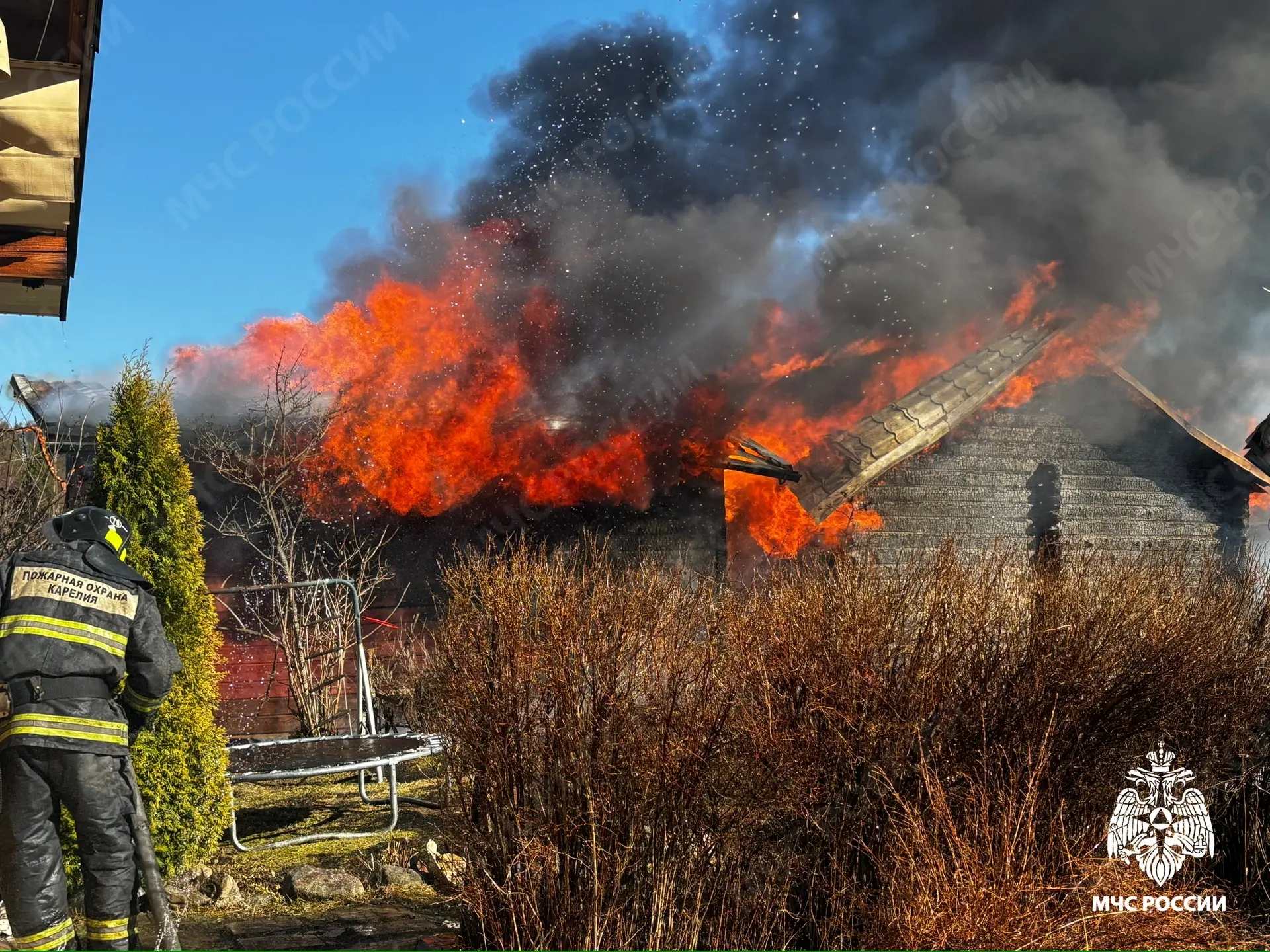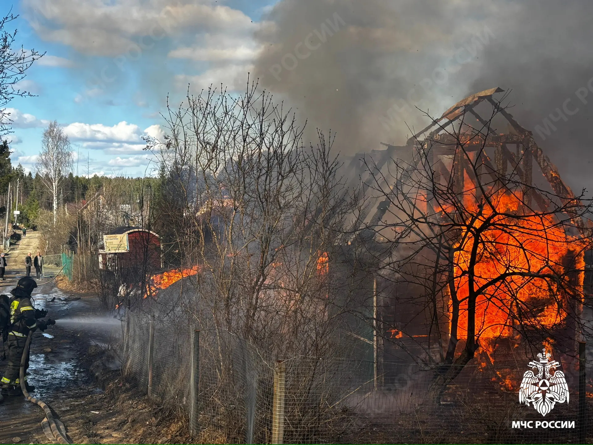 Сообщение о возгорании поступило в 14:37. По прибытии было установлено, что горят два дома, баня и хозяйственная постройка, произошёл взрыв газового баллона. Пожару присвоен ранг 1-БИС.