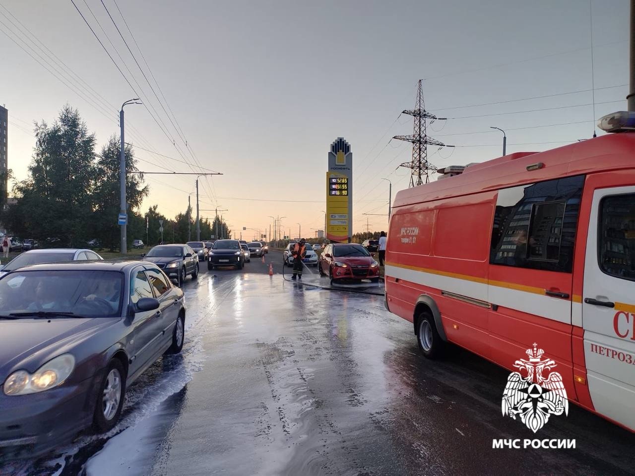 На место выезжали шестеро спасателей и две единицы техники. Специалисты отчистили дорожное полотно от разлитого топлива.