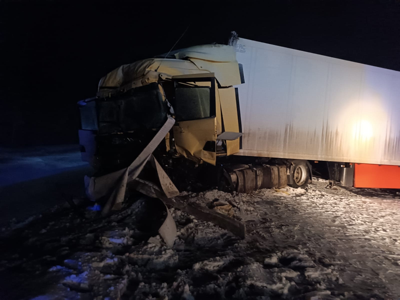 По предварительным данным, 40-летний водитель грузового автомобиля «Renault Premium» в составе с полуприцепом допустил занос полуприцепа, в результате чего произошло столкновение со встречным грузовиком «Scania».