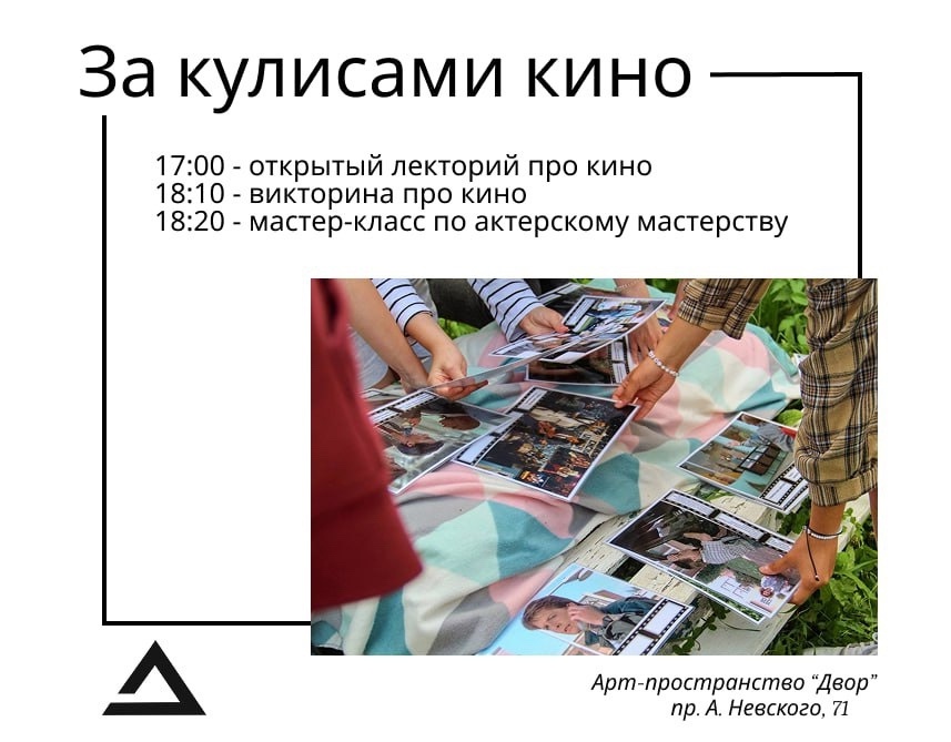 В пятницу, 25 июля, в арт-пространстве «Двор» в Петрозаводске состоится мероприятие, посвященное кино и актерскому мастерству, сообщает городская администрация.