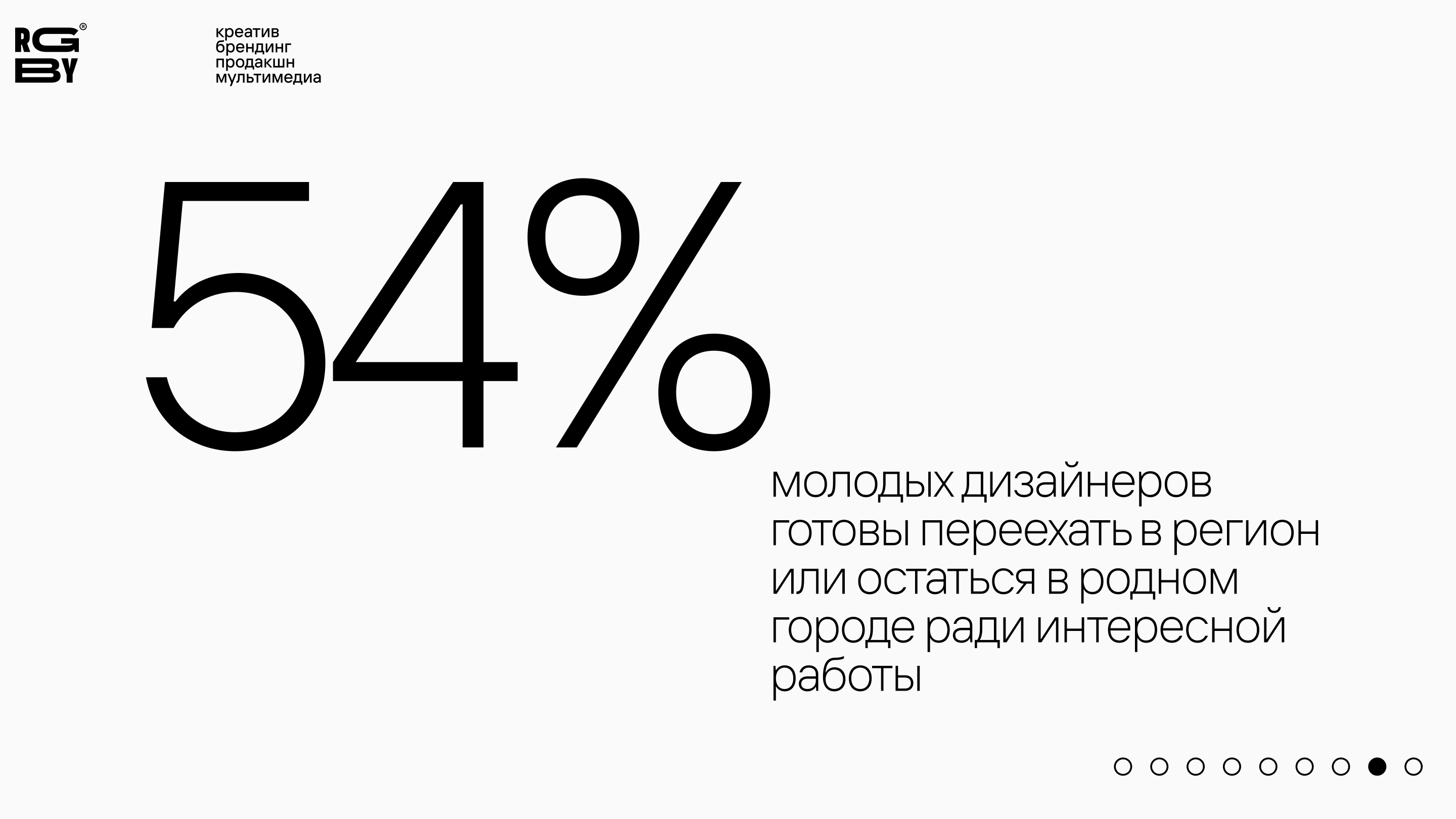 Из данных исследования креативного агентства RGBY и Выставочного научно-исследовательского центра (ВНИЦ) R&C 54% молодых дизайнеров согласны переехать в регион или остаться в родном городе ради интересной работы, еще 31% опрошенных заявили о готовности работать в государственном секторе.