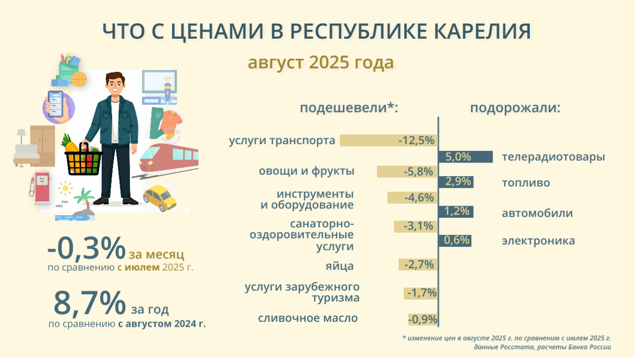 Годовая инфляция в Карелии в августе замедлилась до 8,69% после 9,20% в июле. В целом по стране она также снижается, но пока еще остается существенно выше цели — возвращение инфляции к 4% в 2026 году.