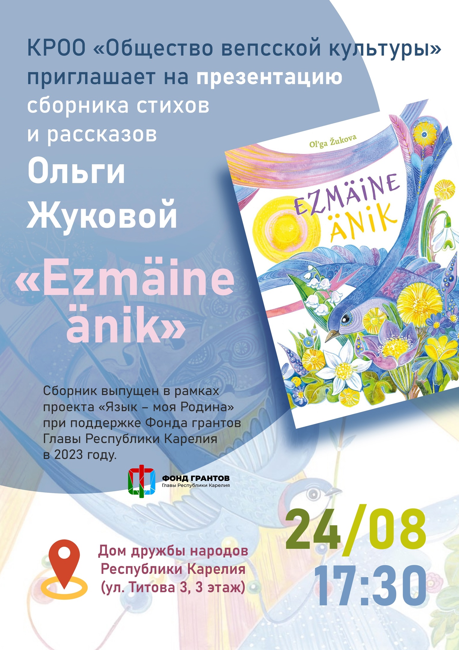 В Петрозаводске пройдет презентация сборника стихов и рассказов на вепсском языке «Ezmäine änik» («Первоцвет») Ольги Жуковой. Об этом сообщает официальная страница Общества вепсской культуры.