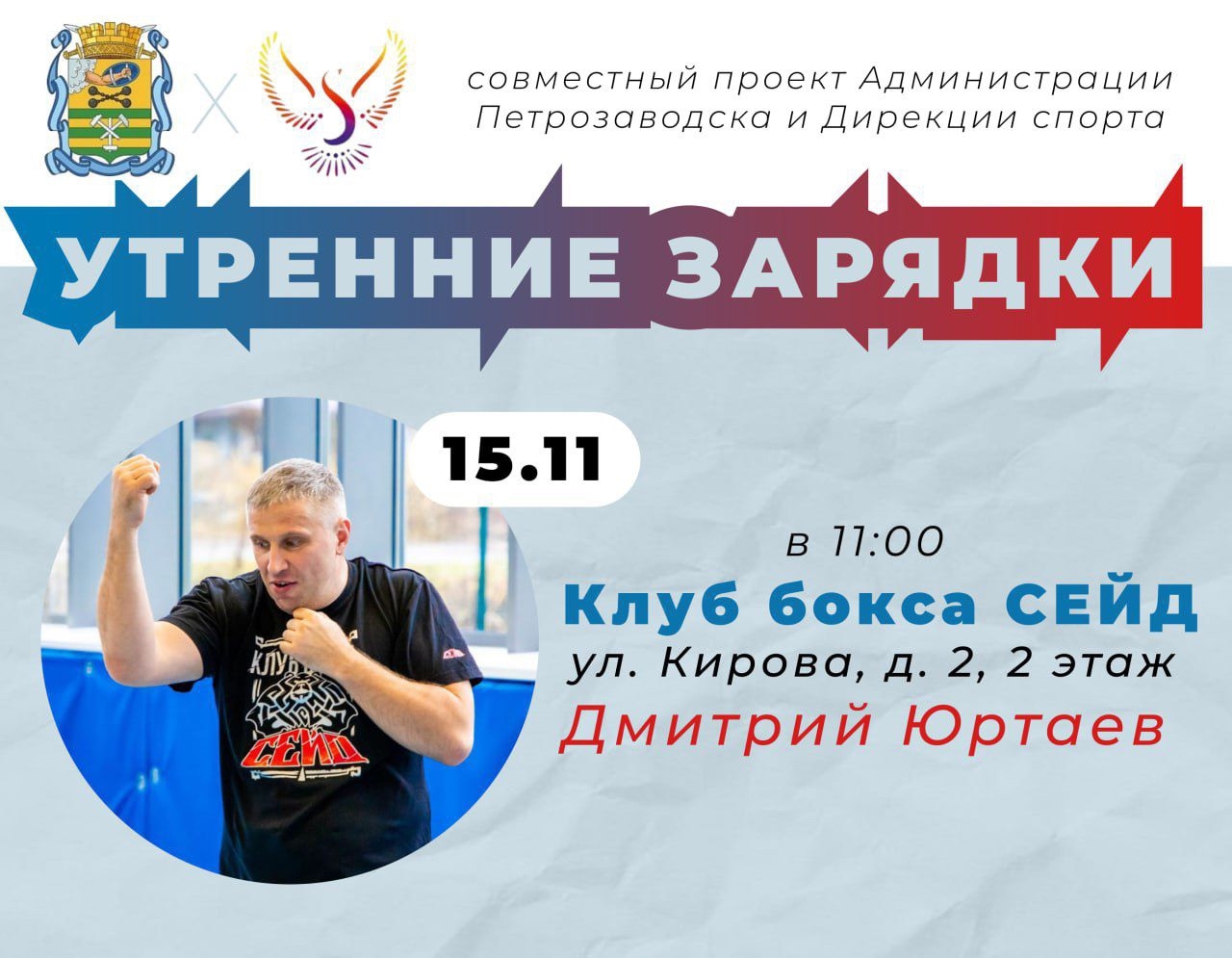 15 ноября в 10:00 состоится традиционная «Утренняя зарядка», сообщает городская Администрация. Ее проведет тренер клуба бокса «Сейд» Дмитрий Юртаев.