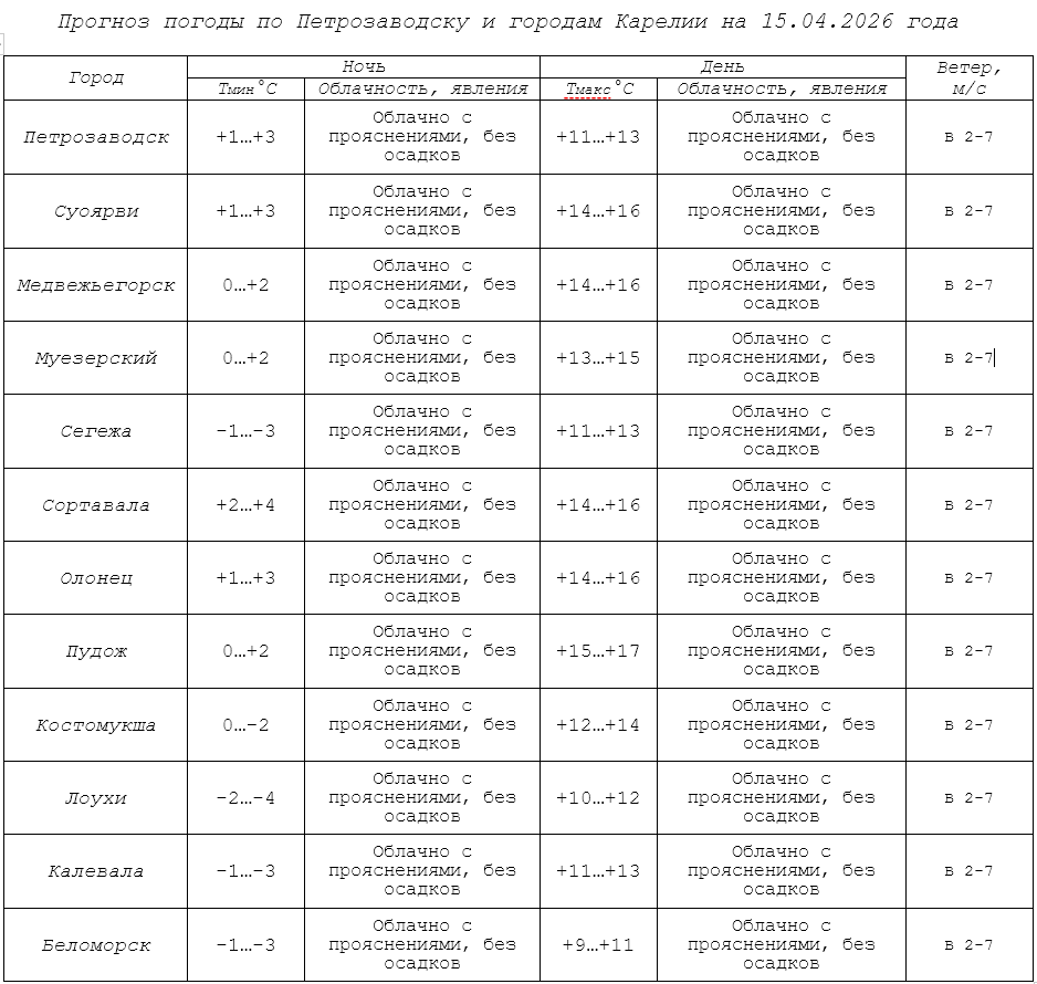 Прогноз погоды по Петрозаводску и городам Карелии на 15 апреля по данным центра «Фобос».