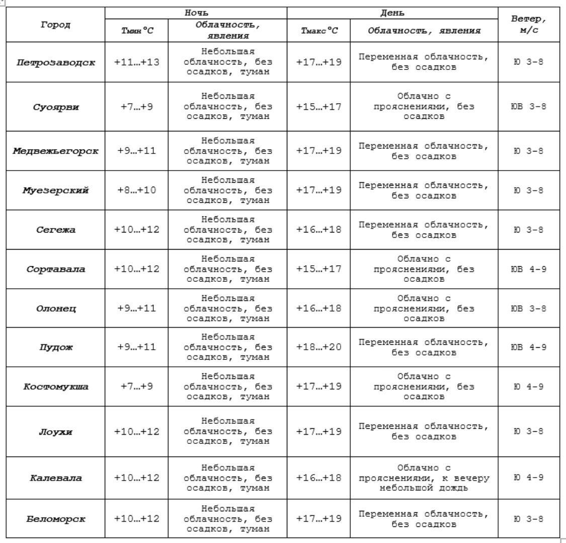 Прогноз погоды по Петрозаводску и городам Карелии на 13.09.25 по данным центра «Фобос».