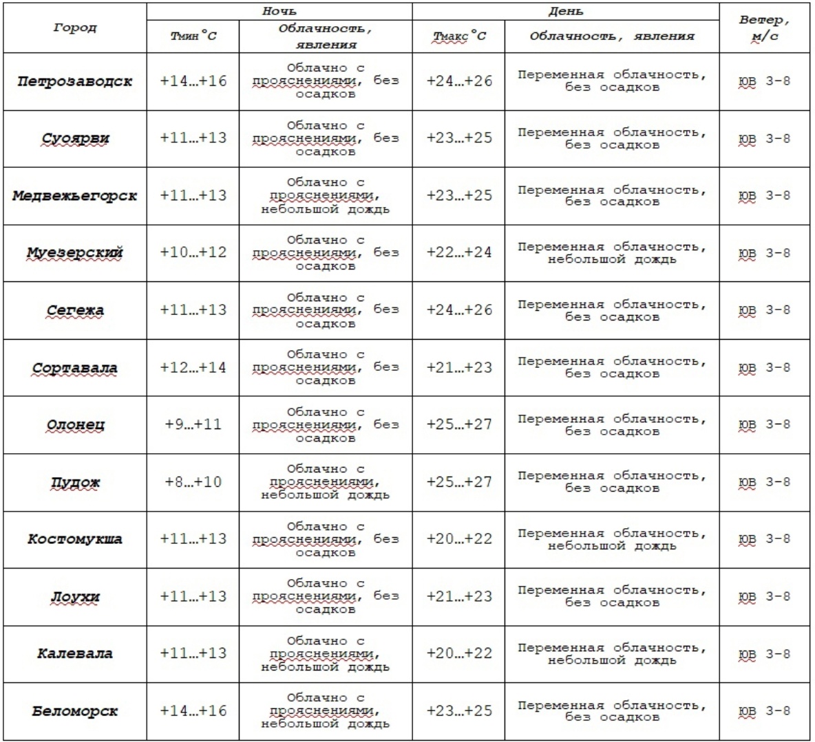 Прогноз погоды по Петрозаводску и городам Карелии на 14.09.24 по данным центра «Фобос».