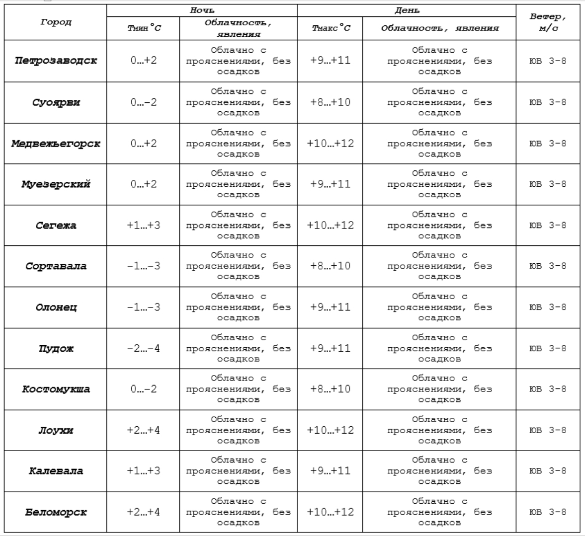 Прогноз погоды по Петрозаводску и городам Карелии на 02.10.25 по данным центра «Фобос».