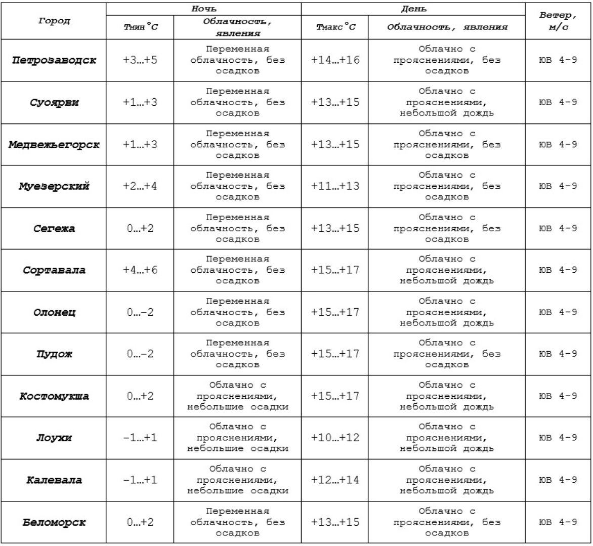 Прогноз погоды по Петрозаводску и городам Карелии на 24.09.24 по данным центра «Фобос».