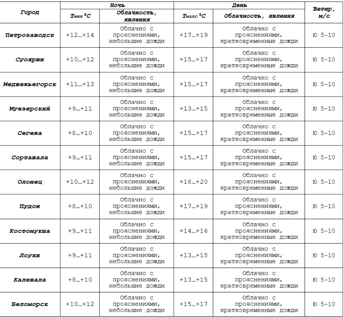 Прогноз погоды по Петрозаводску и городам Карелии на 26.09.24 по данным центра «Фобос».