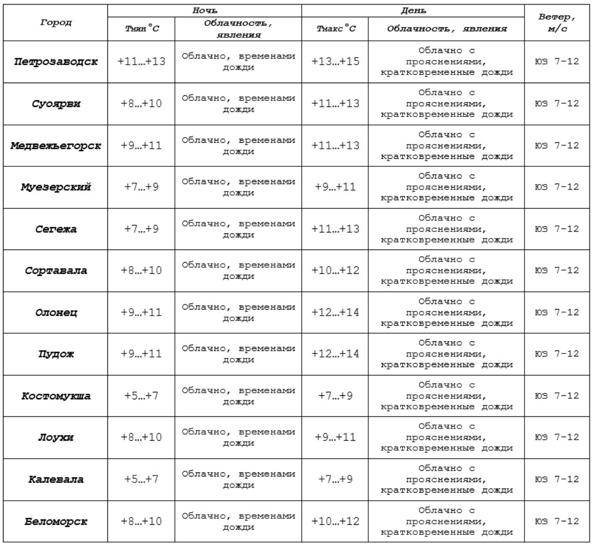 Прогноз погоды по Петрозаводску и городам Карелии на 28.09.24 по данным центра «Фобос».