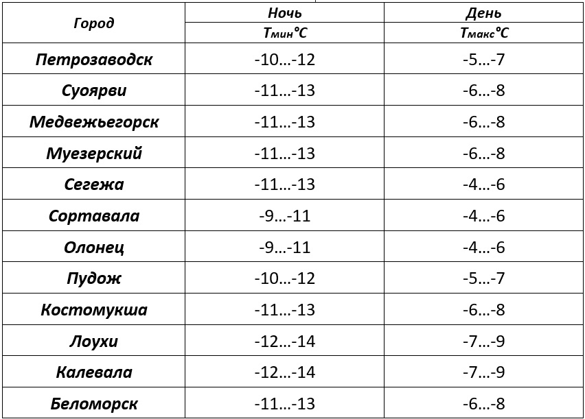 Прогноз погоды по Петрозаводску и городам Карелии на 28.01.2023 по данным центра «Фобос».