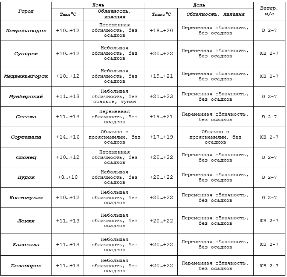 Прогноз погоды по Петрозаводску и городам Карелии на 06.09.25 по данным центра «Фобос».