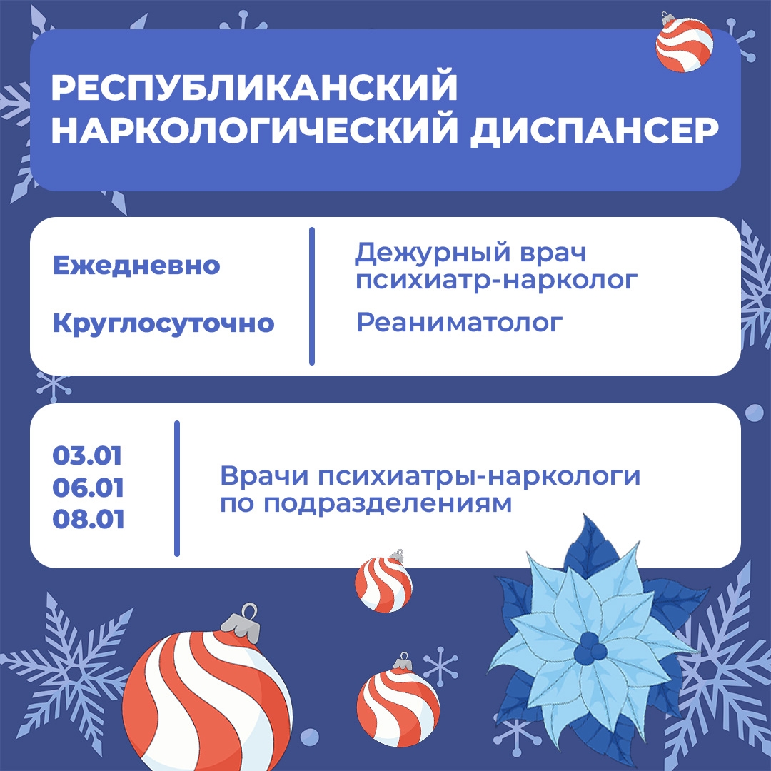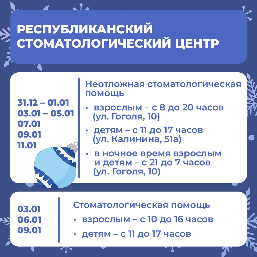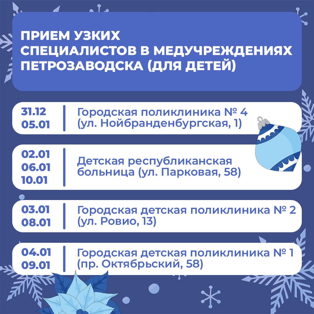 Минздрав Карелии информирует о графике работы медицинских организаций в период с 31 декабря 2025 года по 11 января 2026 года, в новогодние «каникулы».