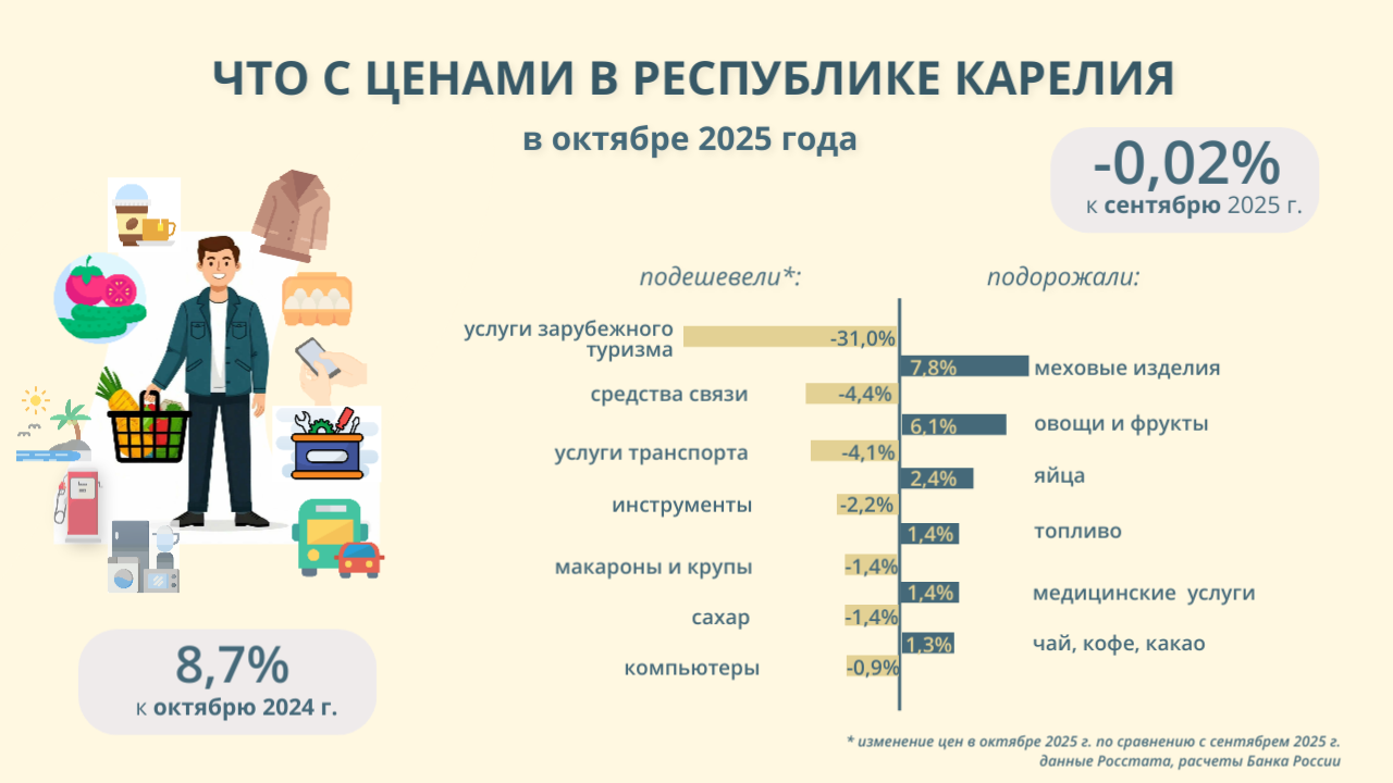Сахар за месяц подешевел благодаря его высоким запасам и ожиданиям дальнейшего роста производства. Снизились цены на смартфоны, инструменты, компьютеры и электронику. Это произошло благодаря тому, что жители Карелии стали меньше покупать эти товары, в том числе и в кредит. Укрепление рубля и снижение спроса в конце турсезона привело к значительному снижению цен на зарубежный отдых.