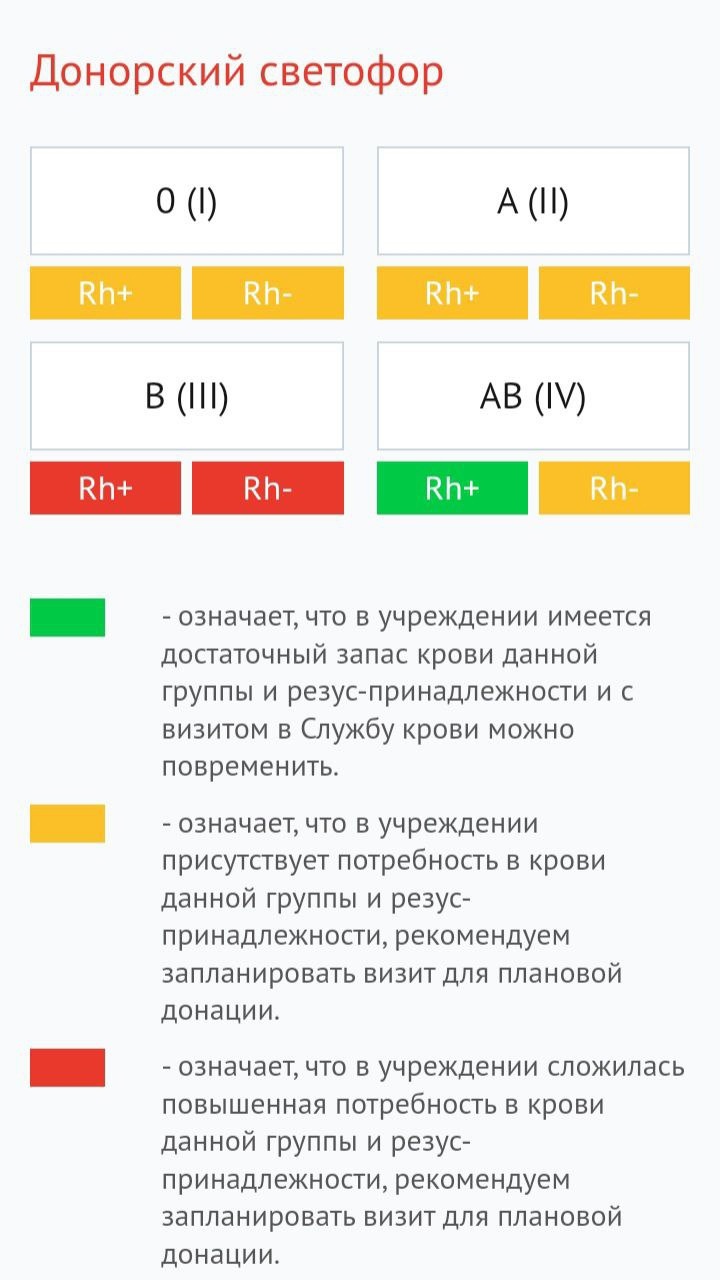 Имеется острая потребность в крови третьей группы положительного и отрицательного резус-фактора. Временные ограничения вводятся на прием доноров четвертой группы крови положительного резус-фактора. Доноры KeII+ не принимаются.