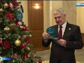 Бизнесмены, меценаты, представители республиканской власти наугад снимают новогодние открытки с ёлки и исполняют загаданные в них желания.