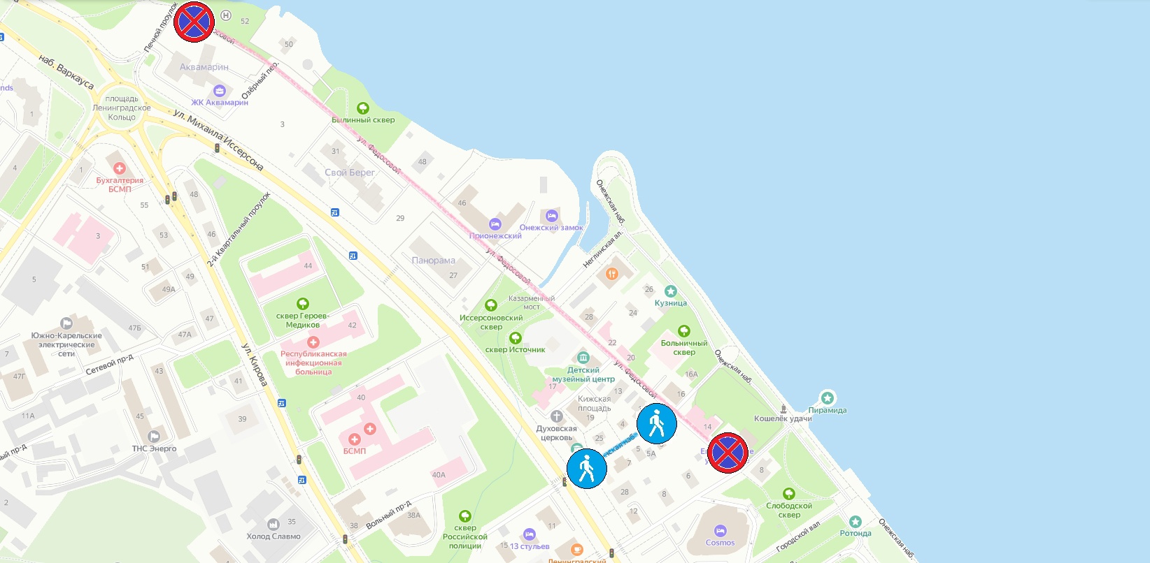Будет закрыт проезд по улицам Пушкинской и Фадеевской, от улицы Куйбышева в сторону Онежской набережной по проспектам Ленина и Карла Маркса, улицам Еремеева и Германа Титова, по улице Луначарского от набережной Гюллинга, через Пименовский мост и по площади Кирова. Накануне вечером вблизи обозначенных мест вступит в силу запрет остановки транспорта.