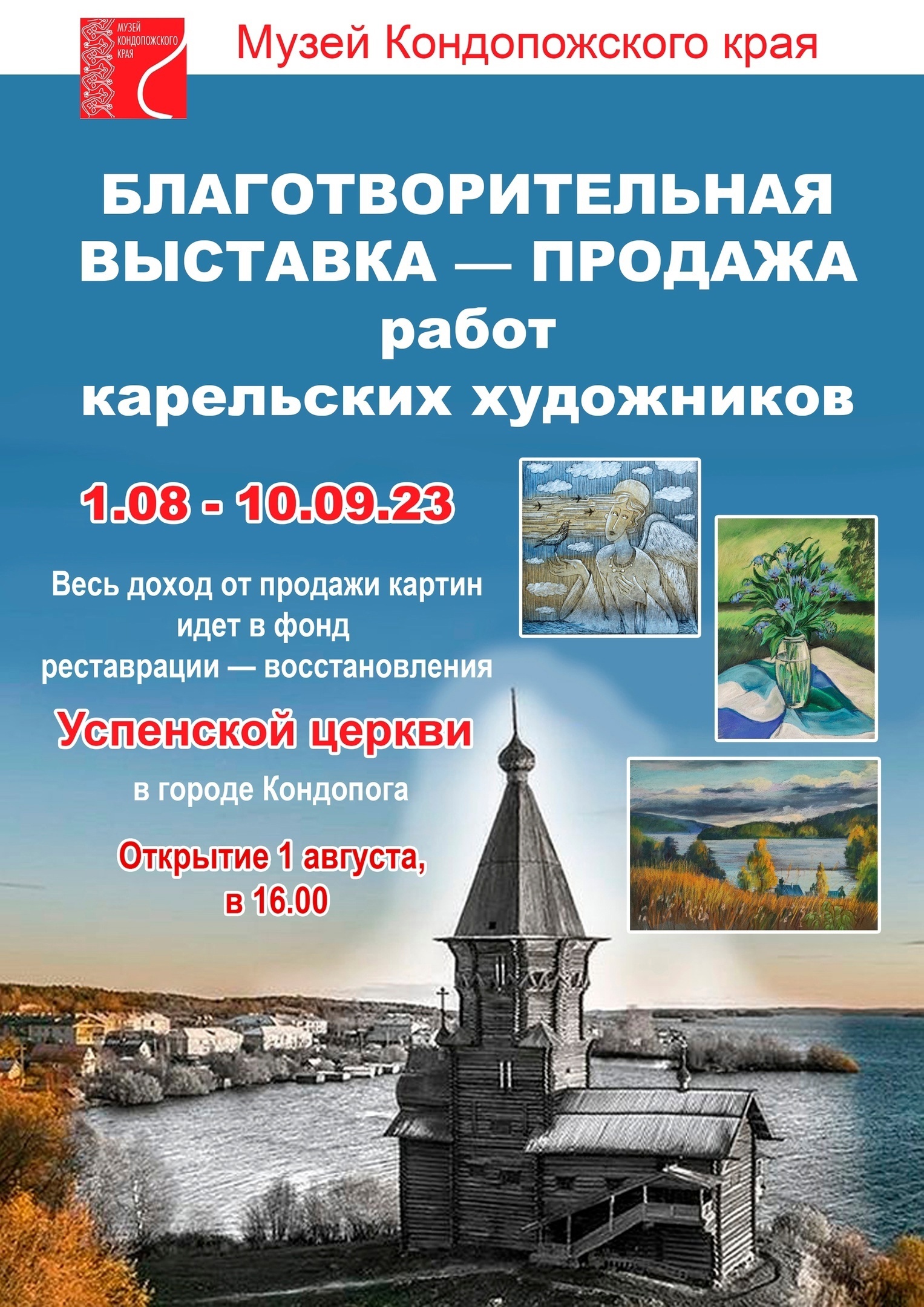 Весь доход от продажи картин пойдет на восстановление сгоревшей Успенской церкви. Выставка продлится до 10 сентября, её можно посетить в музее Кондопожского края.