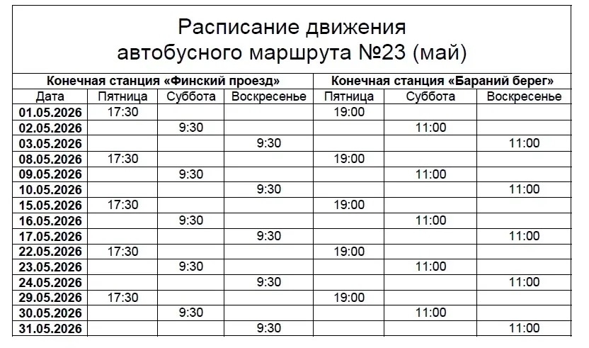 В мае автобусы будут ходить 3 раза в неделю — по пятницам, субботам и воскресеньям.