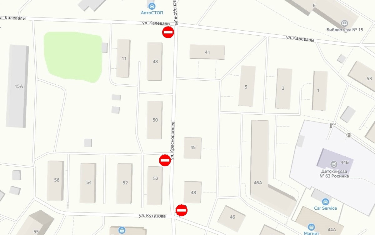 Так, до 31 марта въезд на улицу Краснодонцев запрещен с улиц Калевалы и Кутузова.