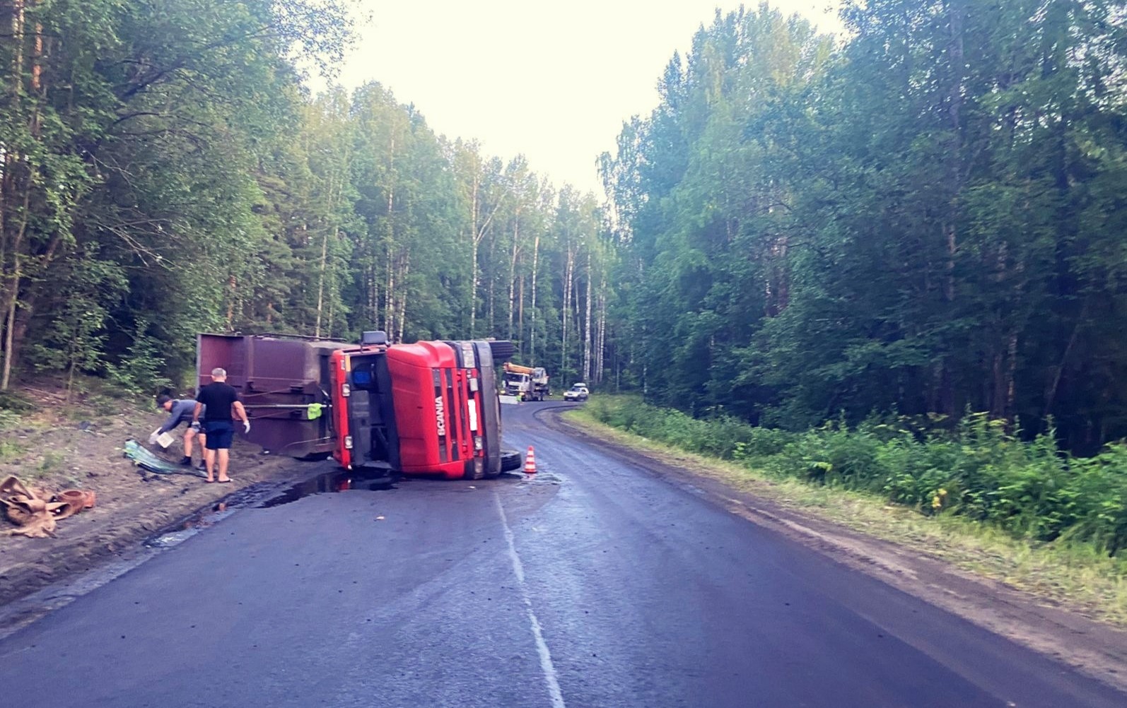 49-летний водитель, управляя «Scania T 124», по неустановленным причинам допустил опрокидывание транспортного средства.