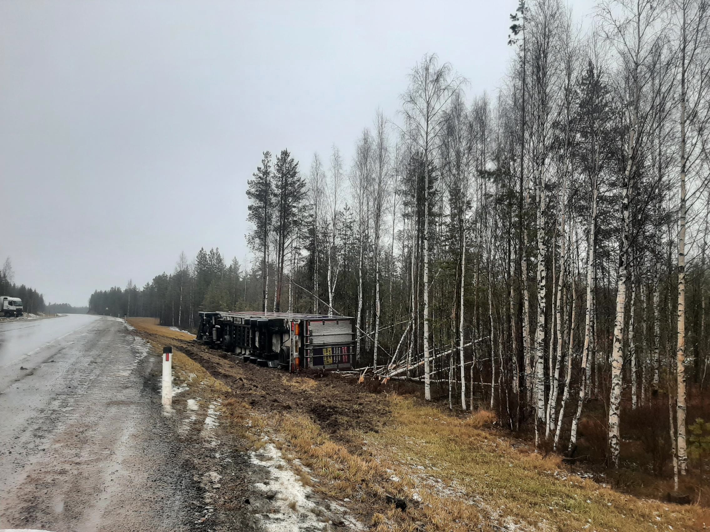 Так, 16 ноября около 2 часов ночи в Сегежском районе, на 747 км автодороги «Кола» съехал с дороги большегруз. По предварительной информации, 49-летний водитель фуры «Foton Auman» с прицепом не справился с управлением. В результате ДТП получил травмы 40-летний пассажир, мужчина был госпитализирован.