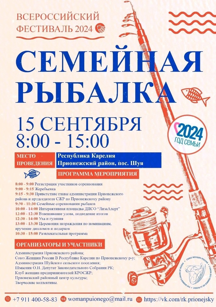Жителей Карелии приглашают принять участие во Всероссийском фестивале «Семейная рыбалка — 2024», которая состоится 15 сентября в поселке Шуя Прионежского района. Организаторы мероприятия : Совет женщин Прионежского района и Администрация Прионежского района