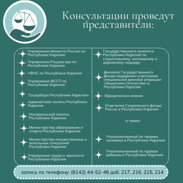 С 16:00 до 18:00 горожан проконсультируют специалисты Минюста, Федеральной службы судебных приставов, налоговой службы, Росреестра, Министерства образования и спорта, Управления труда и занятости, и других ведомств. На прием необходима предварительная запись — сделать это можно по номеру телефона: 8 (8142) 44-52-48 (добавочный 217, 216, 215, 214).