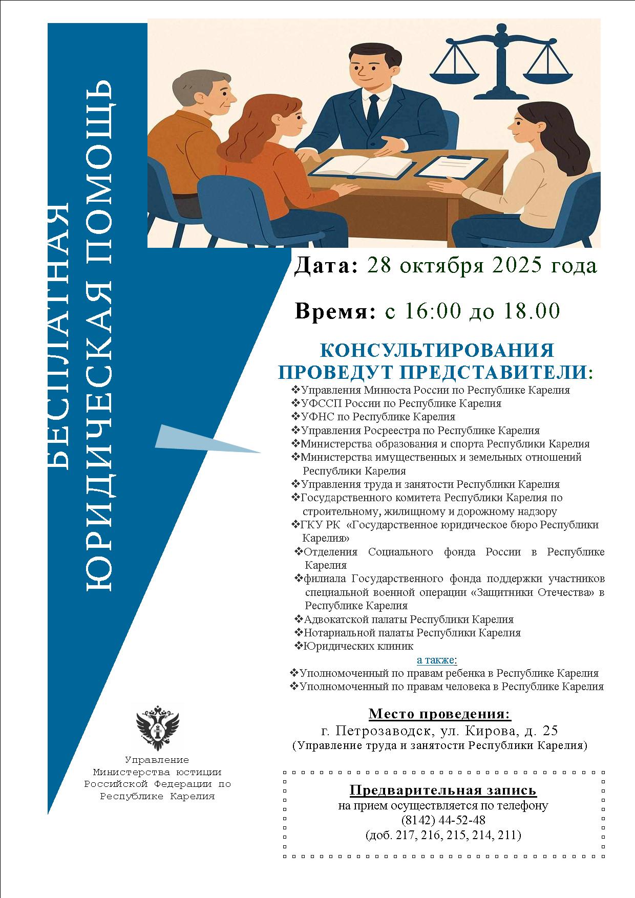 28 октября жители Карелии смогут бесплатно получить юридическую помощь, сообщает Управление Минюста России по Карелии.