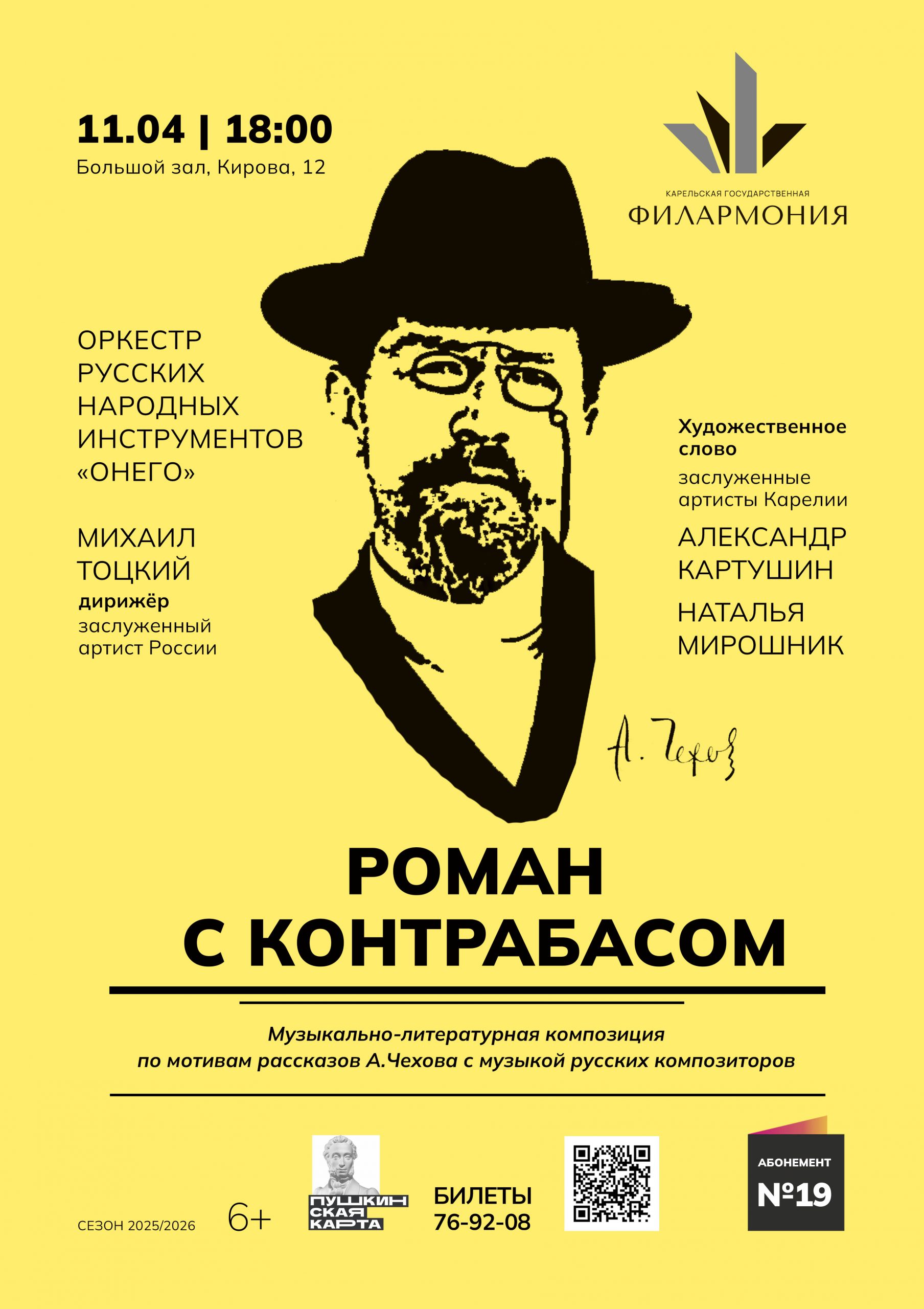 Это заключительный концерт абонемента «Музыка любимых книг». Концерт «Роман с контрабасом» посвящён рассказам Антона Павловича Чехова. Человеческие пороки и слабости, юмор и повседневные дела, любовь и ненависть — в рассказах Чехова есть место всем проявлениям человеческой натуры.