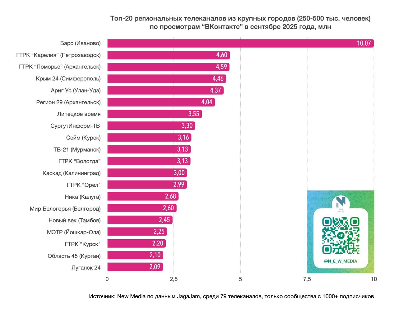 ГТРК «Карелия» вышла на второе место по суммарному количеству просмотров в соцсети «Вконтакте» среди 79 региональных телеканалов из городов с населением 250 — 500 тысяч человек. Статистику за сентябрь 2025 года предоставило аналитическое агентство Нью Медиа.