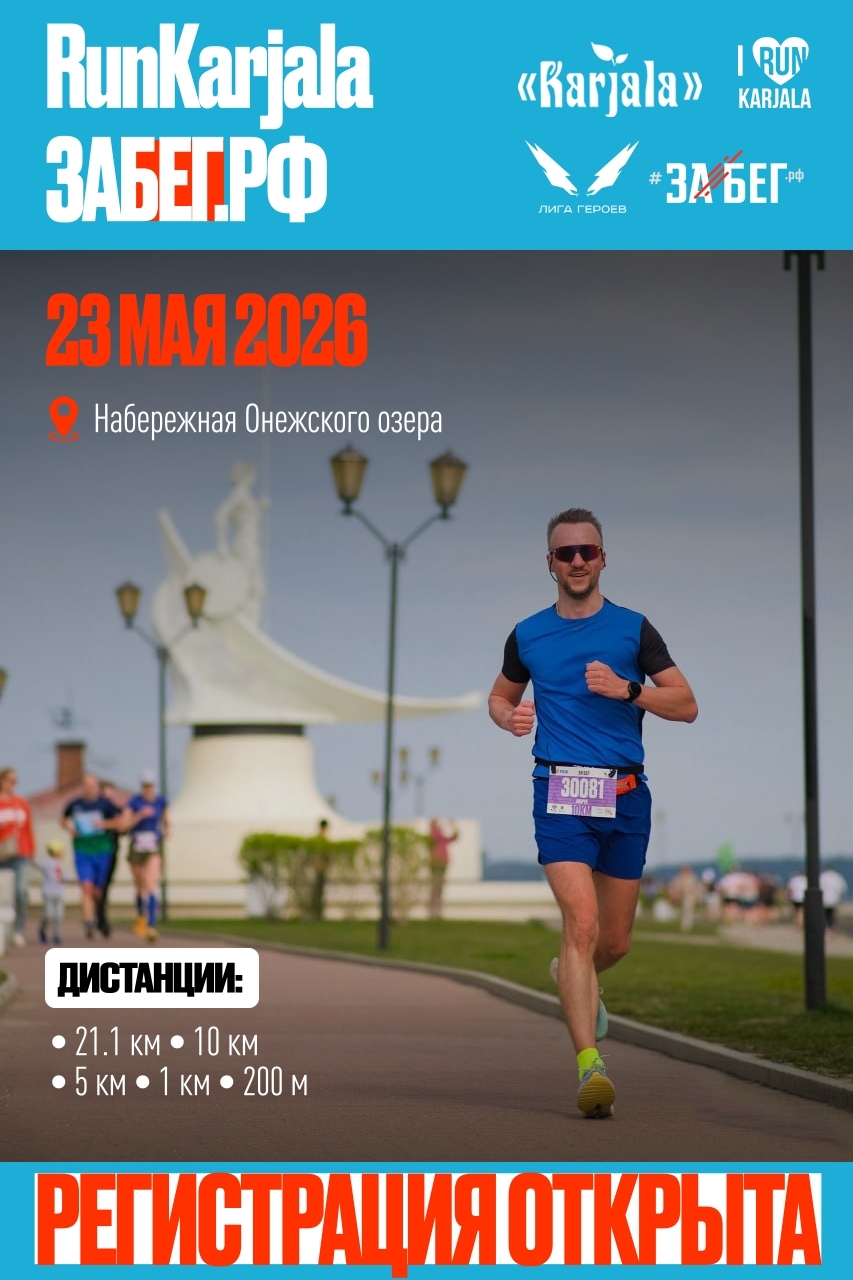 Началась регистрация на «RunKarjala/Забег.РФ» в Петрозаводске. Предстоящий старт 23 мая 2026 года традиционно пройдет на живописной набережной Онежского озера.