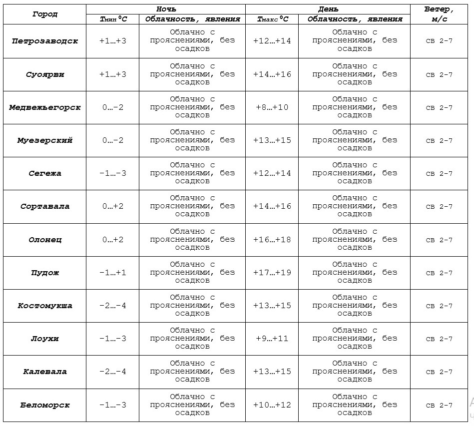 Ветер северо-восточный, 2–7 метров в секунду. В Петрозаводске ночью +2…+4, днем +10…+12 градусов.