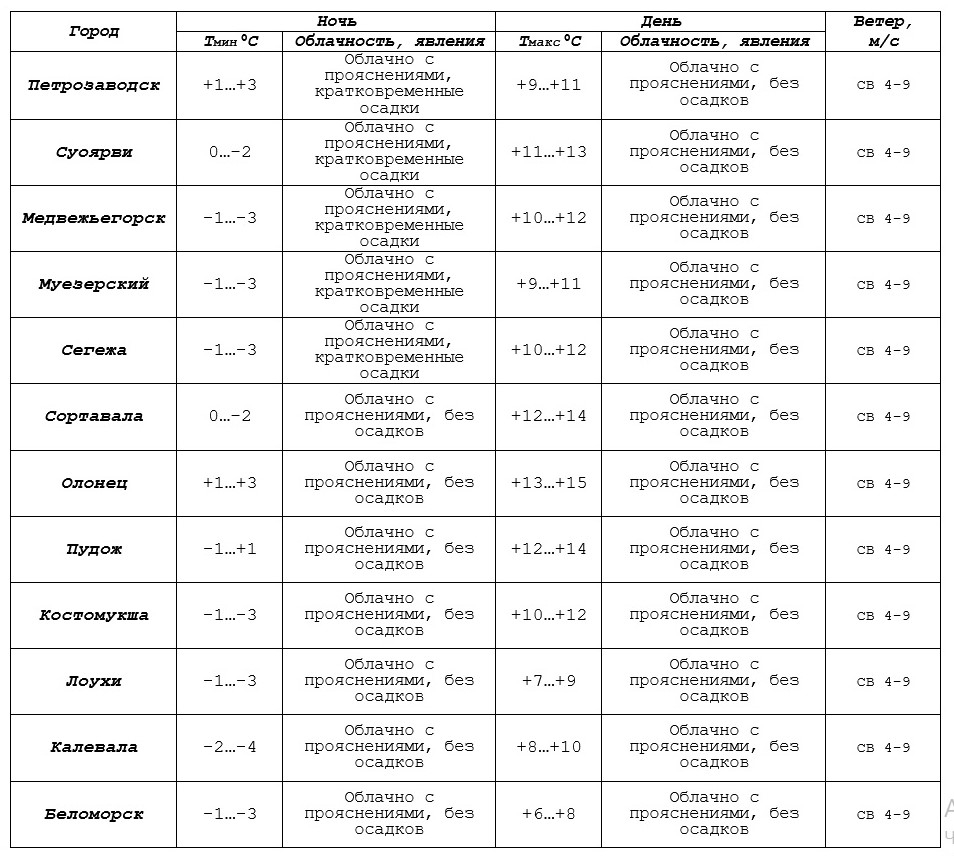 Ветер северо-восточный, 4–9 метров в секунду. В Петрозаводске ночью +1…+3, днем +9…+11 градусов.