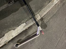 Мальчик ехал на самокате по пешеходному переходу.