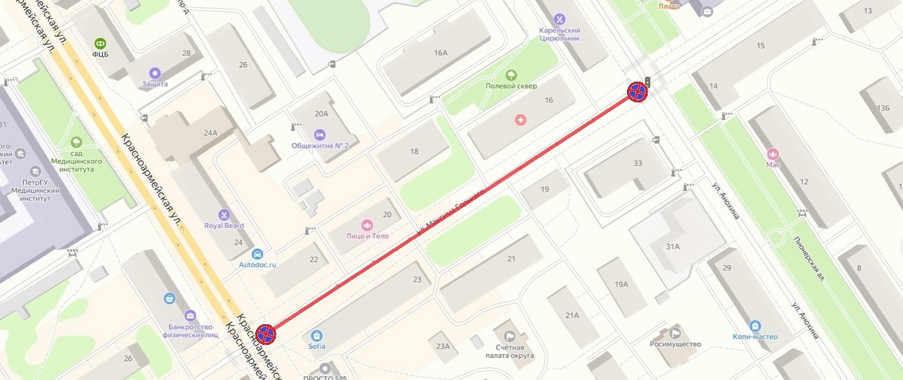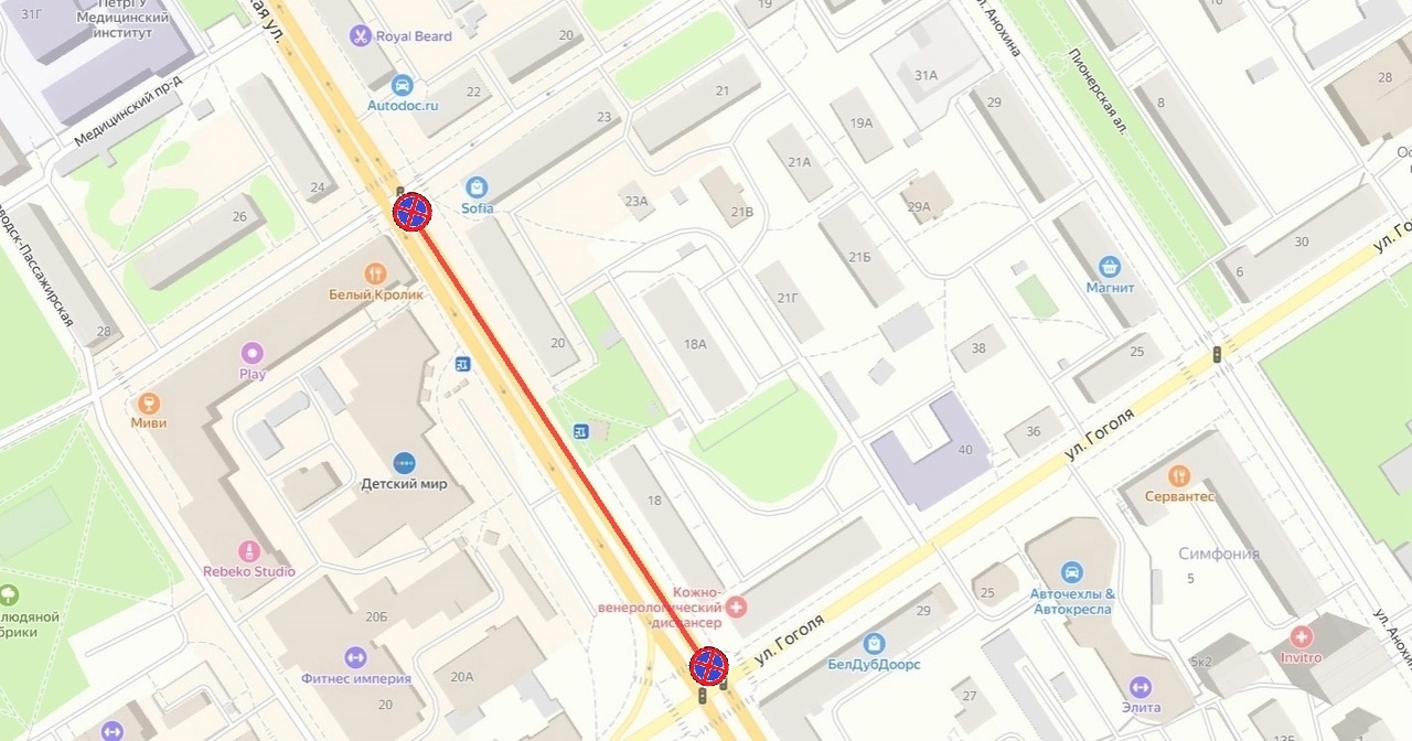 Помимо этого, остановка и стоянка запрещены на участке Красноармейской улицы на пересечении с улицами Гоголя и Максима Горького.