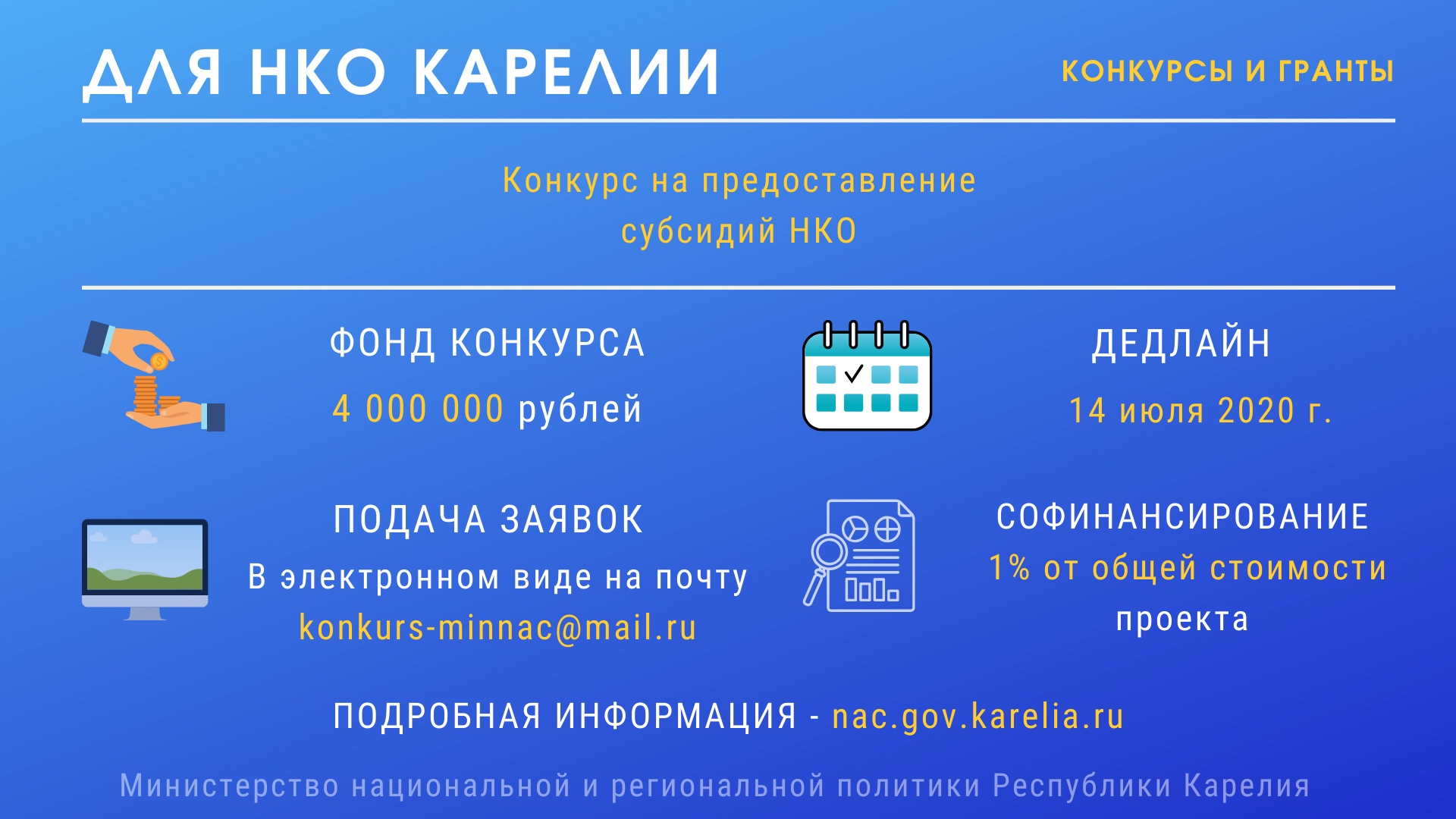 Заявки отправляйте в электронном виде на адрес: konkurs-minnac@mail.ru до 17:00 14 июля. Пакет документов также можно прислать почтой, а консультации по подготовке документов получить по телефону: 8 (814-2) 76-10-22 (Симаков Владимир Сергеевич, Лябегин Дмитрий Николаевич). Подробности о правилах участия и требованиям смотрите на сайте Министерства по ссылке.