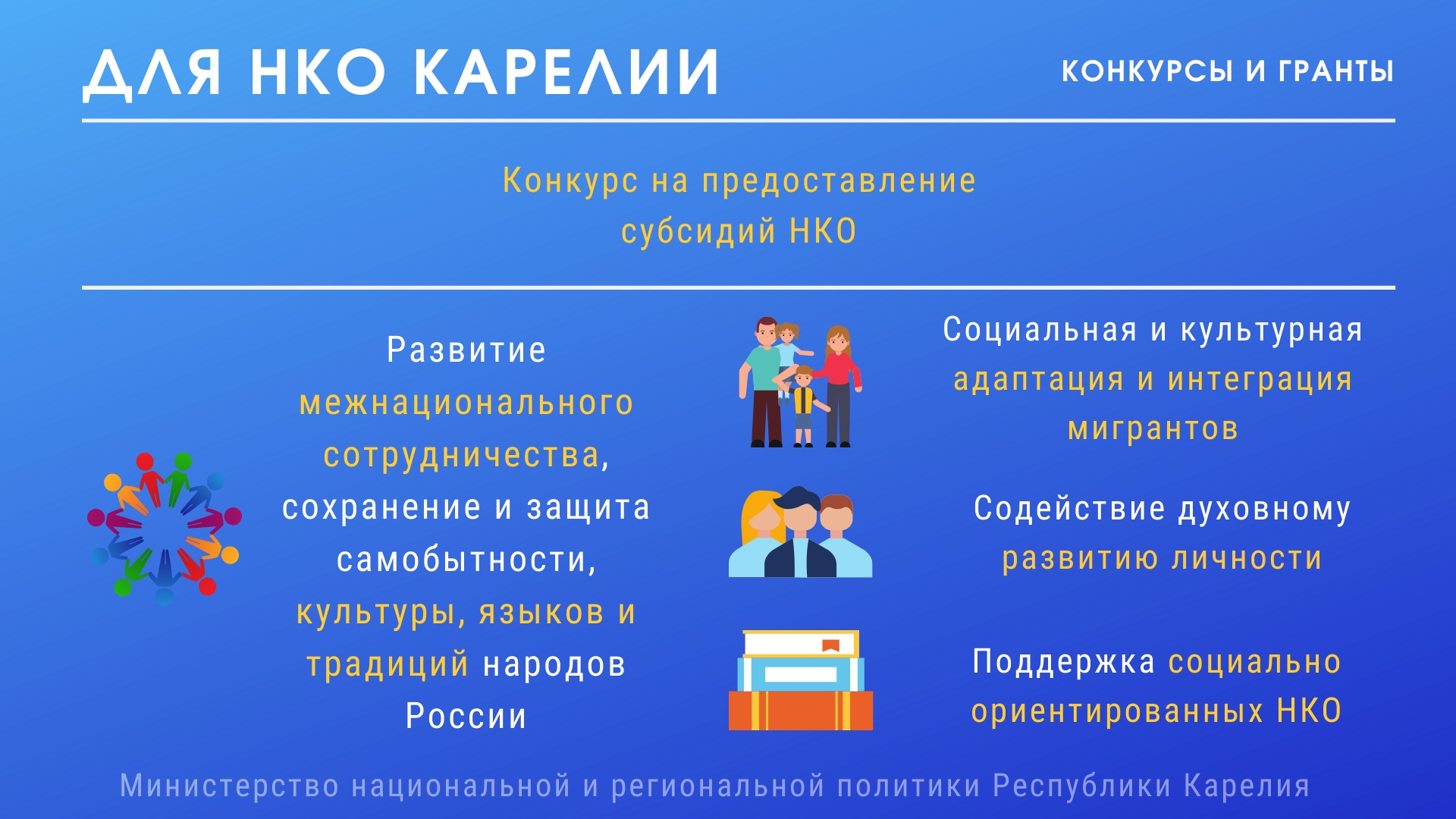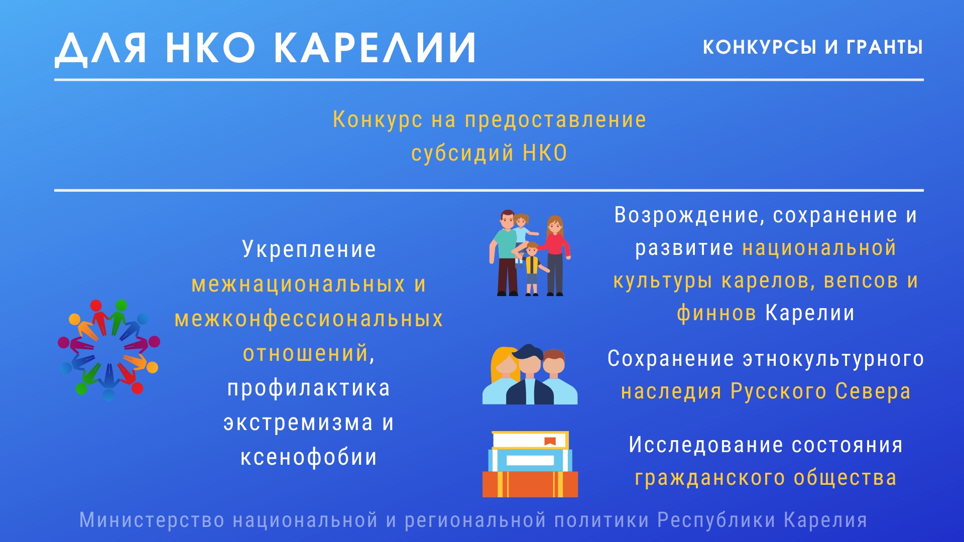 Среди направлений поддержки — развитие межнационального сотрудничества, сохранение самобытности, культуры, языков и традиций народов Карелии; социальная и культурная адаптация и интеграция мигрантов; информационная и методическая поддержка социально ориентированных НКО и другие.